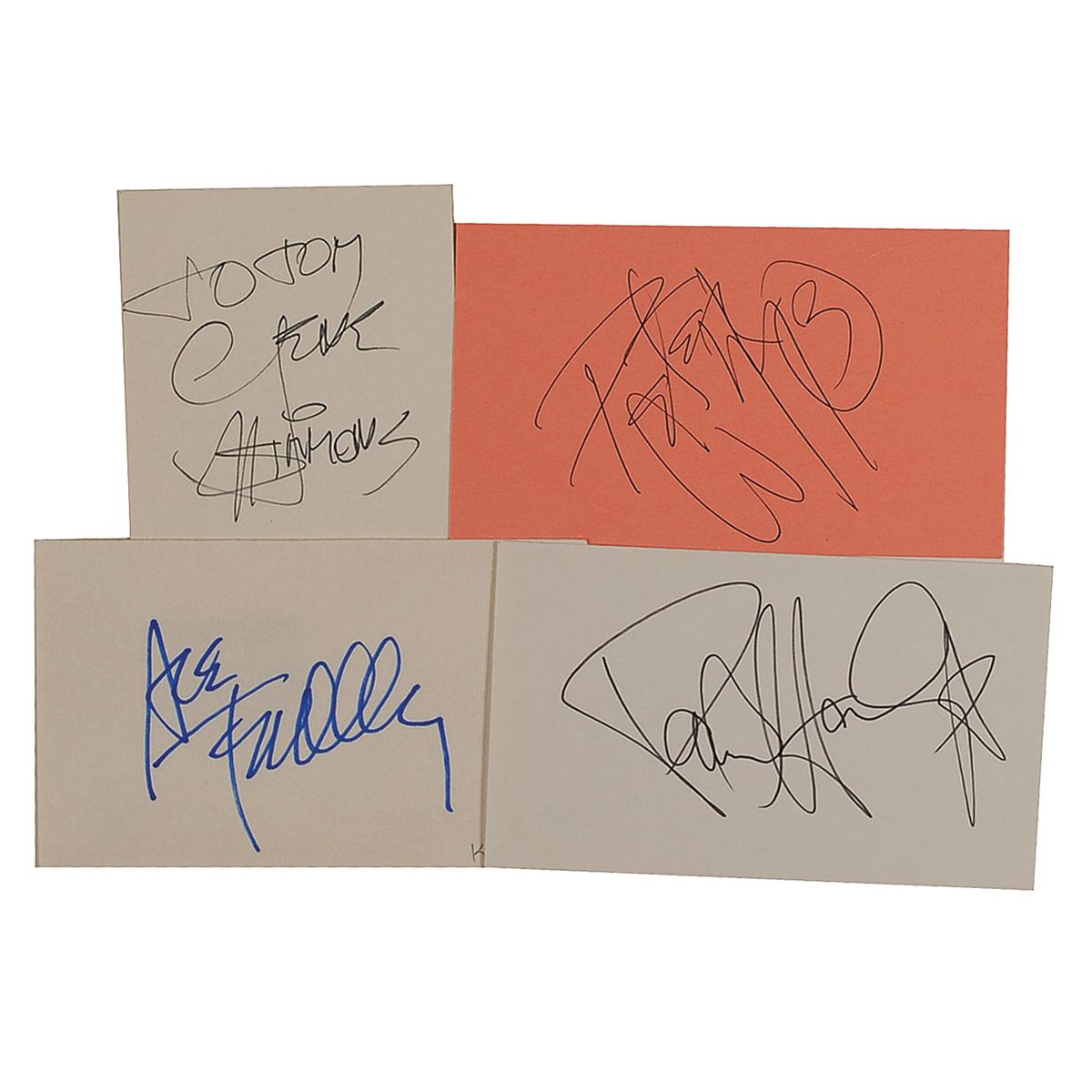 Ink and felt tip signatures, “Paul Stanley,” “Peter Criss,” “Ace Frehley,” and “To Tom, Gene Simmons,” on individual off-white and salmon-colored 5 x 3 cards. In fine condition, with a PSA/DNA authentication label affixed to reverse of each card. Accompanied by four certificates of authenticity from PSA/DNA.