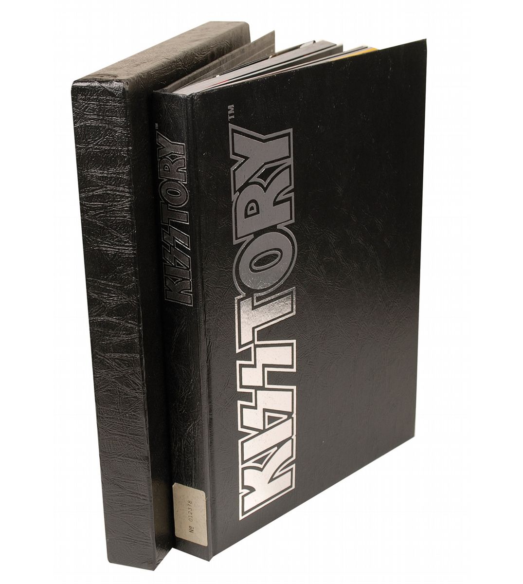 Signed book: KISStory. Limited edition #12378. Los Angeles: Kisstory Ltd., 1994. Hardcover with slipcase, 433 pages. Signed in black felt tip on a special signature page by Paul Stanley, Gene Simmons, Peter Criss, Ace Frehley, Eric Singer, and Bruce Kulick. In fine condition.