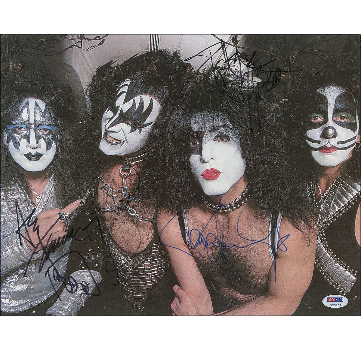 Color 14 x 11 cardstock postcard photo, signed in black felt tip by Ace Frehley, Gene Simmons, and Peter Criss, and in blue felt tip by Paul Stanley. In fine condition, with some scattered light rubbing, and light to moderate contrast to Simmons and Criss’s signatures, a few corner creases, and a PSA/DNA authentication label affixed to lower corner. Accompanied by a full letter of authenticity from PSA/DNA.