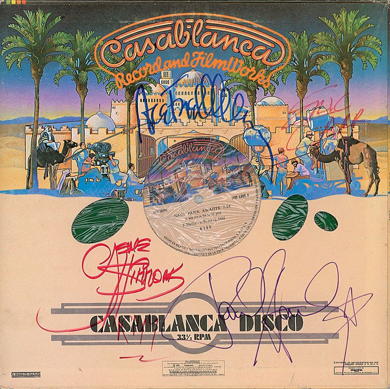 ‘I Was Made for Lovin’ You/ Charisma’ Colored (Green) Vinyl 12" Maxi-Single album signed on the back cover in felt tip by Paul Stanley, Gene Simmons, Ace Frehley, and Eric Carr (1950–1991). In fine condition, with slight separation to the top of the sleeve and Carr’s signature light but legible. The record is included. Signed on March 14, 1981, when KISS appeared in Mexico City on TV Azteca for an interview and lip-synched television performance in support of their then-new Elder album. Fully signed ‘make-up era’ items like this are quite difficult to come by.