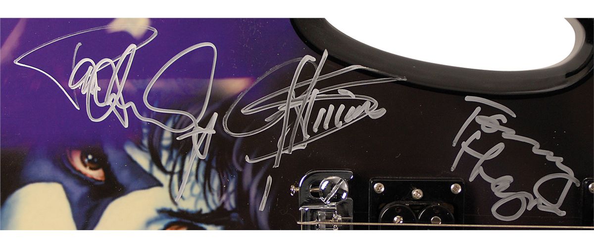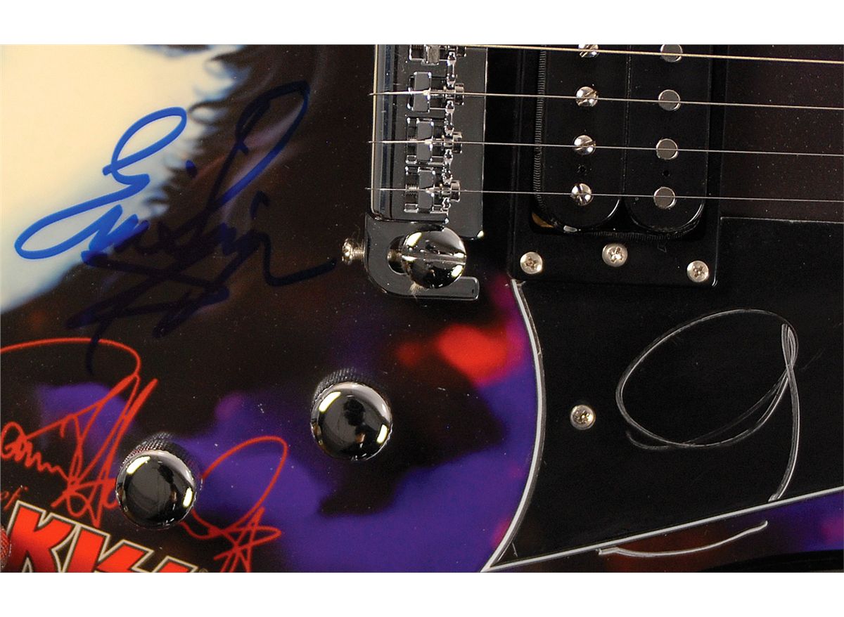 Exceptional Washburn PS400 Paul Stanley electric guitar, with an image of Stanley on the body, as well as the band’s name and Stanley’s facsimile signature, signed on the body in silver ink by Gene Simmons, Paul Stanley, and Tommy Thayer and in blue felt tip by Eric Singer. There is an extra “G” from Simmons starting his signature on the pickguard. In fine condition. All signatures were acquired on July 21, 2012, at Farm Bureau Live in Virginia Beach during their World Tour and the guitar is accompanied by a letter of provenance from the original recipient of the signatures, as well as the original colorful gig bag. A rock and roll rarity as the band routinely refuses to sign any musical instruments. Oversized.