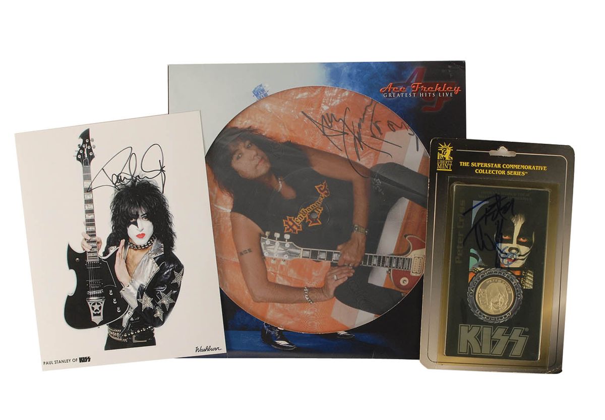 Color cardstock 8 x 10 photo of Paul Stanley, signed in black felt tip; Peter Criss Superstar Commemorative Collector Series coin, signed on the front of the package in blue felt tip, adding a quick cat sketch; and Ace Frehley’s Greatest Hits Live double picture disc album, one signed in black felt tip, the other signed in silver ink, with Frehley adding playing card sketches to both. In fine condition, with yellowing to coin packaging.