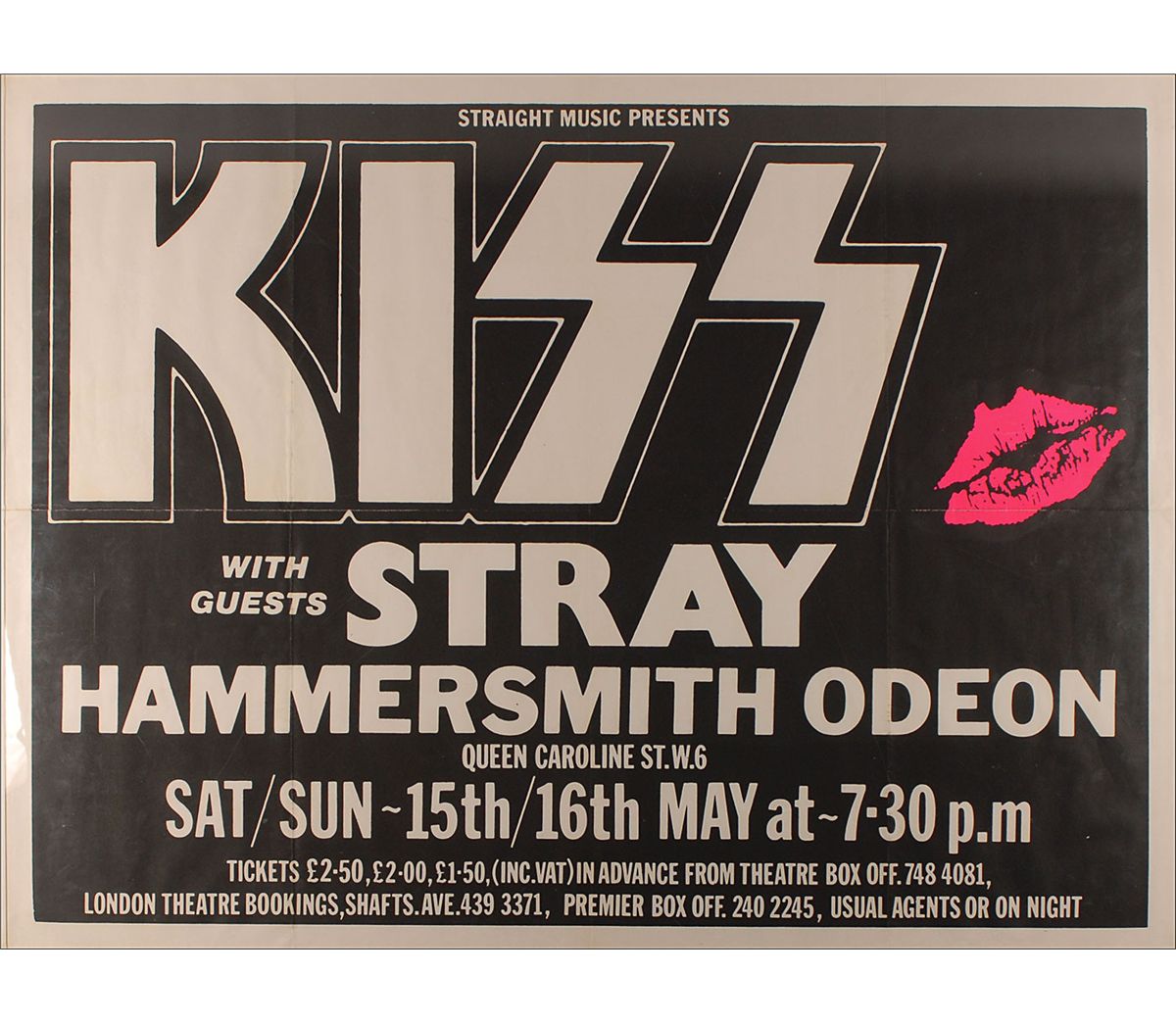 Original color 40 x 30 poster for the group’s third ever performance on British soil which took place at The Hammersmith Odeon, in London, England, on May 15 and 16, 1976. In very good condition, with previous storage folds, a 14? separation along one horizontal fold, and scattered creases. In 1976 as part of the Alive world tour, the group performed in just three British cities: Manchester, Birmingham, and London. Rolled. Accompanied by a certificate of authenticity from Tracks.