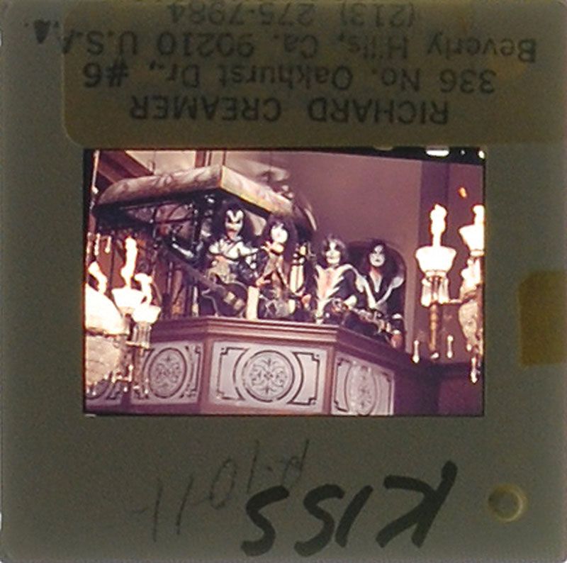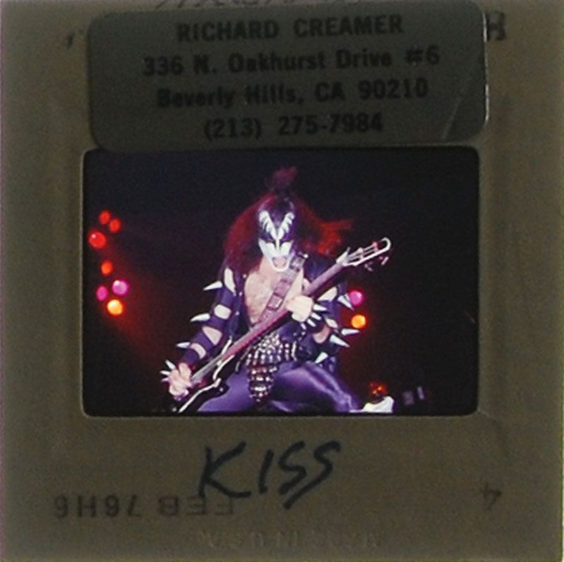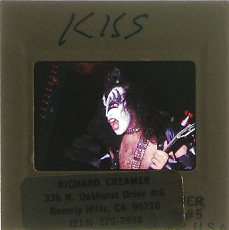 Three original unsigned color slides, two of KISS performing and one group portrait, each image measuring 1.25 x 1 inside a 2 x 2 cardboard or plastic mount. Mounts bear ink notations and tags from the photographer, Richard Creamer. In overall fine condition. Provenance: Richard Creamer Estate. Creamer was a famous Rolling Stone photographer very active and well known in the 1970s Los Angeles Rock scene. The collection of Creamer photos offered in this auction were kept in his personal collection and several appeared in magazines.