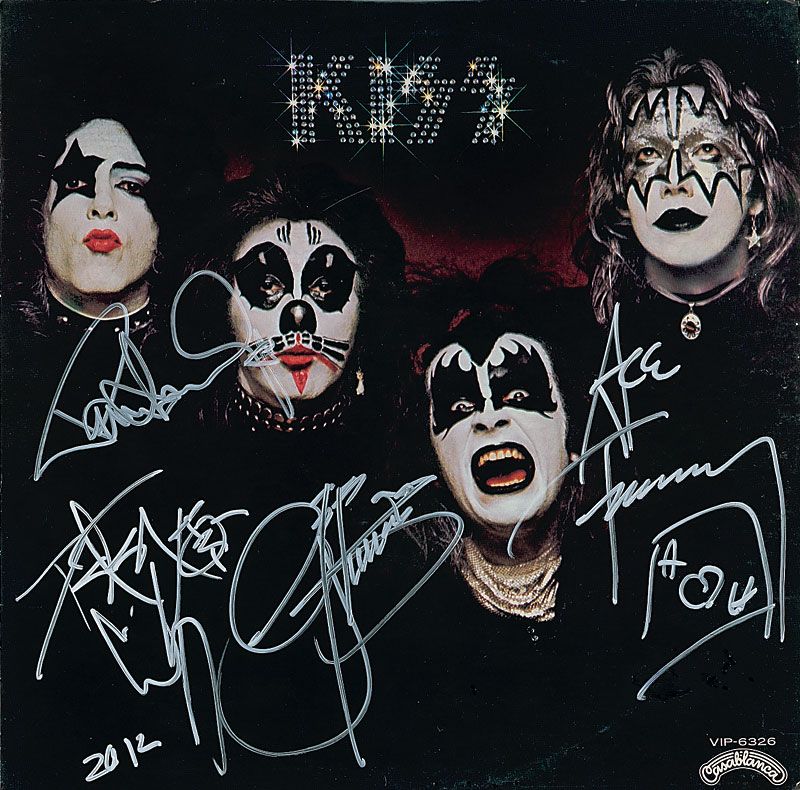 Self-titled debut album signed on the front cover in white paint pen sharpie by Paul Stanley, Gene Simmons, Peter Criss (adding “2012”), and Ace Frehley, adding a playing card sketch under his signature. In fine condition, with a light ‘ring of wear’ to front cover and a couple minor spots under Frehley’s signature. The record is included.