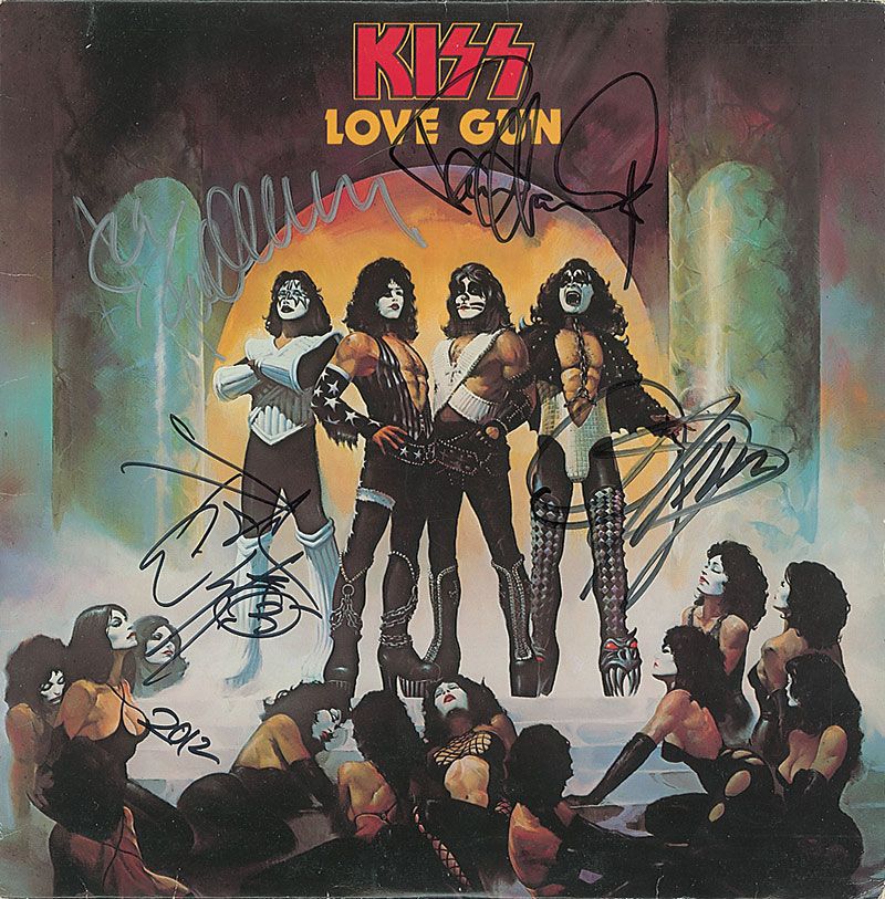 Love Gun album signed on the front cover in black felt tip by Gene Simmons, Paul Stanley, and Peter Criss, and in silver ink by Ace Frehley, and by Paul Stanley on the reverse in black felt tip. In fine condition, with some mild edge creases and scattered light surface marks. The record is included.