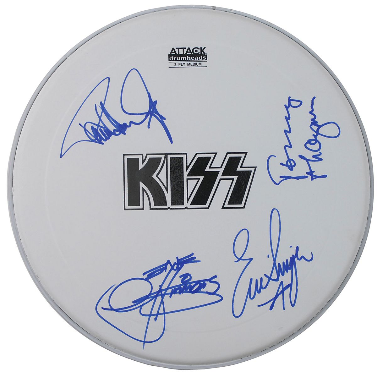 Unused 14? Attack drumhead, with the band’s name in the center, signed in blue felt tip by Paul Stanley, Gene Simmons, Eric Singer, and Tommy Thayer. In fine condition. Consignor notes signatures were acquired during the 2010 Hottest Show on Earth tour.