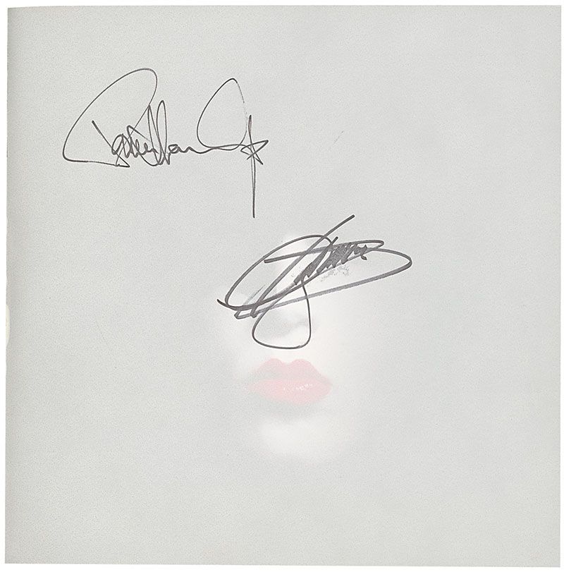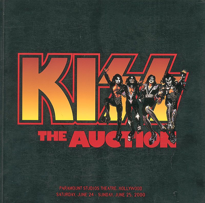 KISS: The Auction catalog, from the 2000 auction held at Paramount Studios Theatre in Hollywood, 12.5 x 12.5, 186 pages. Signed in black felt tip on a special signature page by Paul Stanley and Gene Simmons. Scattered cover wear as well as expected handling wear, otherwise fine condition.