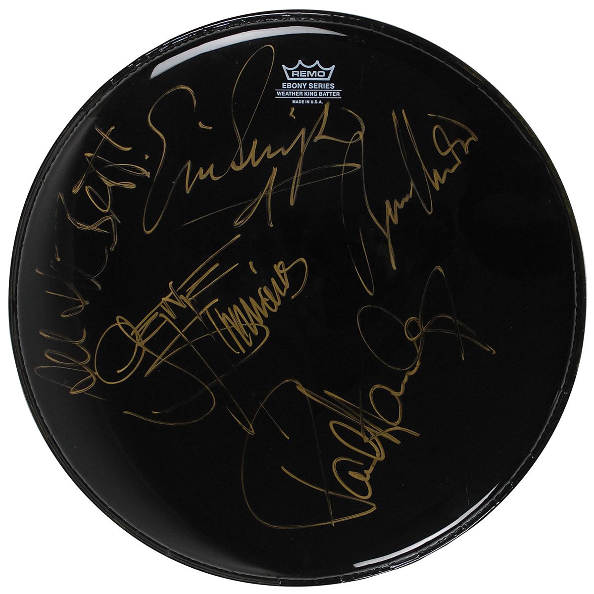 Unused black 14? Remo Ebony Series drumhead, signed in gold ink by Paul Stanley, Gene Simmons, Eric Singer, and Bruce Kulick. In fine condition, with a light spot to center of drumhead.