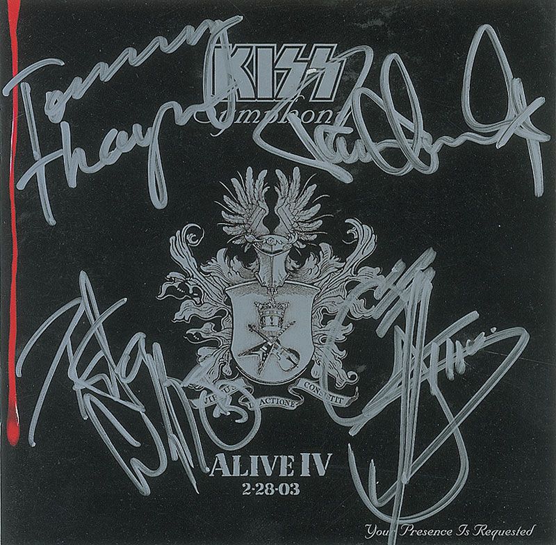 Symphony: Alive IV CD booklet signed on the front cover in silver ink by Gene Simmons, Paul Stanley, Tommy Thayer, and Peter Criss. In fine condition. The CD is not included.