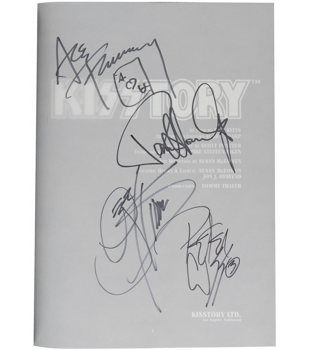 Signed book: KISStory. Los Angeles: KISStory Ltd., 1994. Hardcover with slipcase, 10.75 x 15, 433 pages. Signed in black felt tip on a special signature page by Paul Stanley, Gene Simmons, Peter Criss, and Ace Frehley, adding a small playing card sketch. In fine condition
