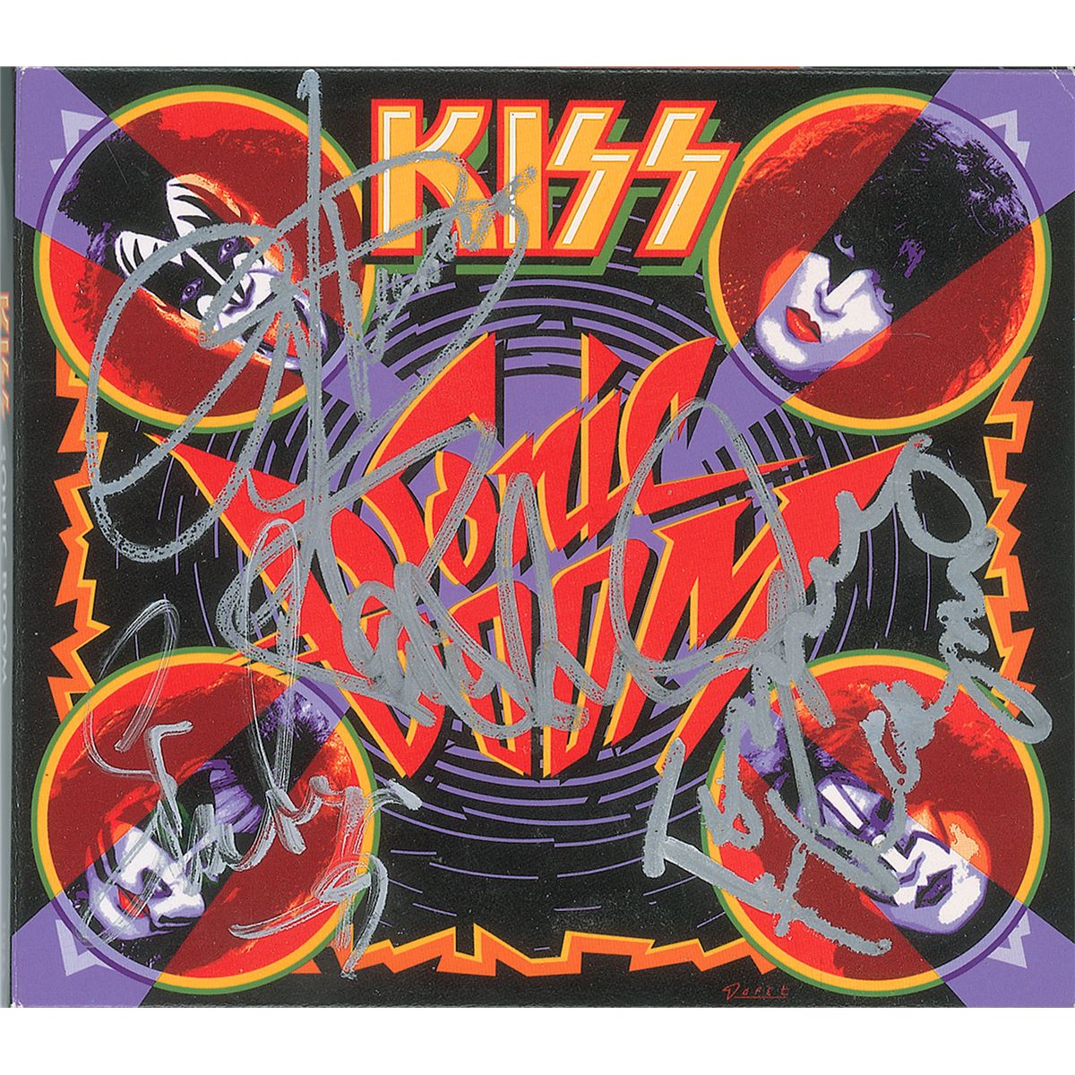 Sonic Boom CD/DVD set signed on the front digi-pack cover in silver ink by Gene Simmons, Paul Stanley, Tommy Thayer, and Eric Singer. In fine condition, with slight irregular adhesion to ink. The CDs and DVD are included.