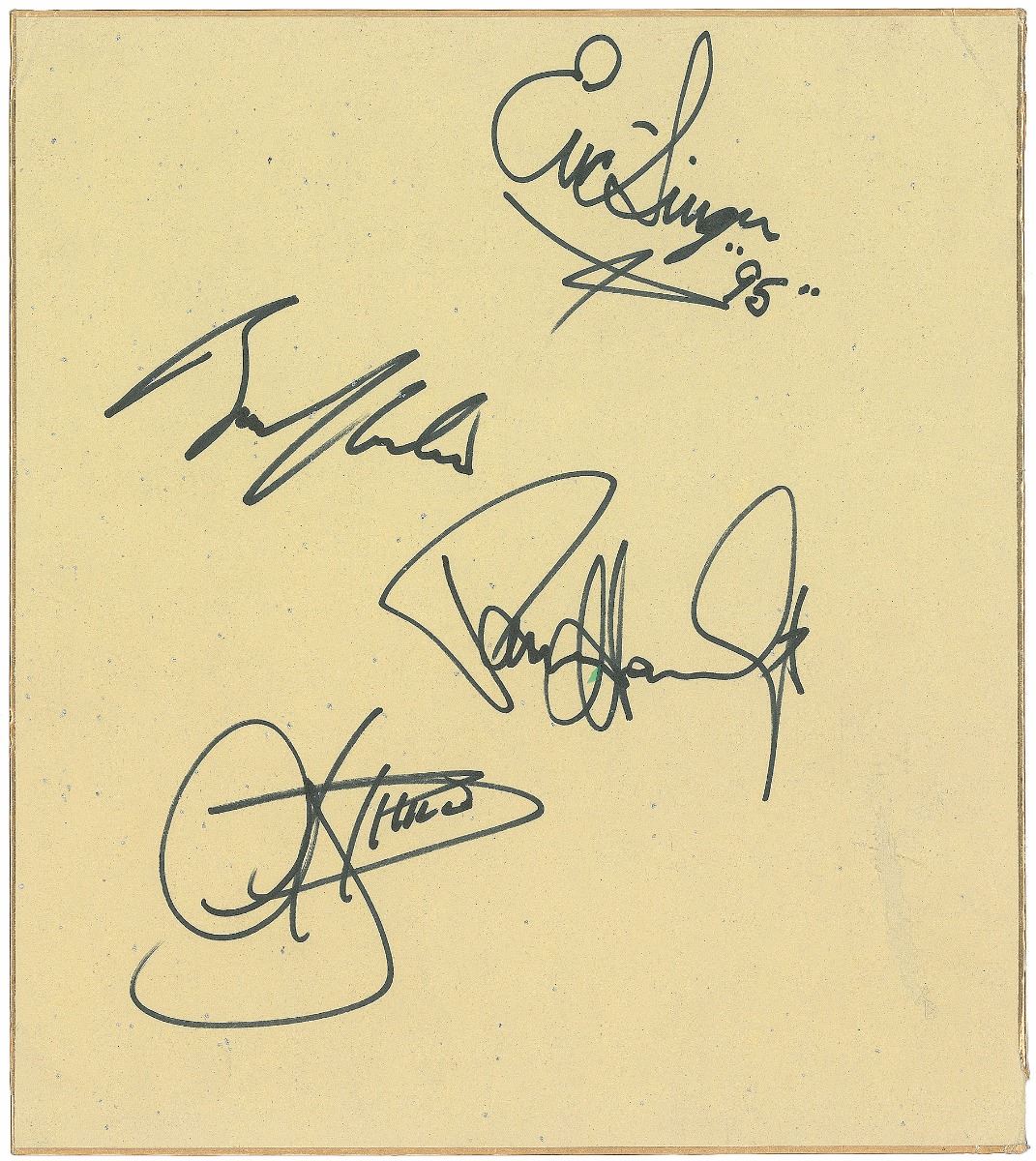 Felt tip signatures of Paul Stanley, Bruce Kulick, Gene Simmons, and Eric Singer, who adds “‘95,’” on an off-white 9.5 x 10.75 sheet of gilt-edged cardstock. In fine condition, with a few creases and an area of surface paper loss to lower right blank area.