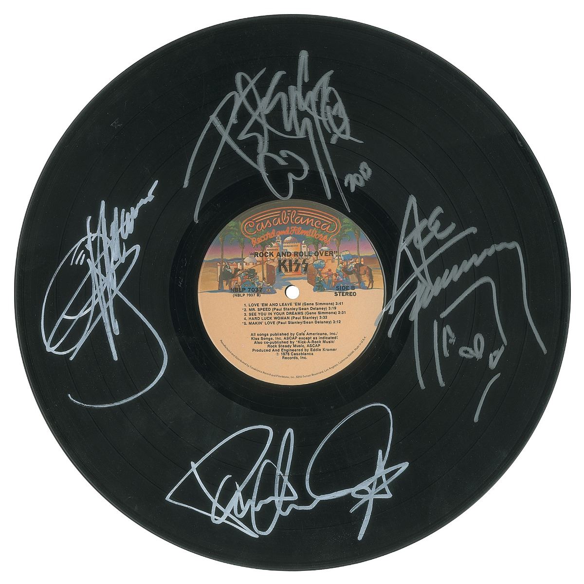 Rock and Roll Over vinyl record signed in silver ink by Gene Simmons, Paul Stanley, Ace Frehley, and Peter Criss. In fine condition.