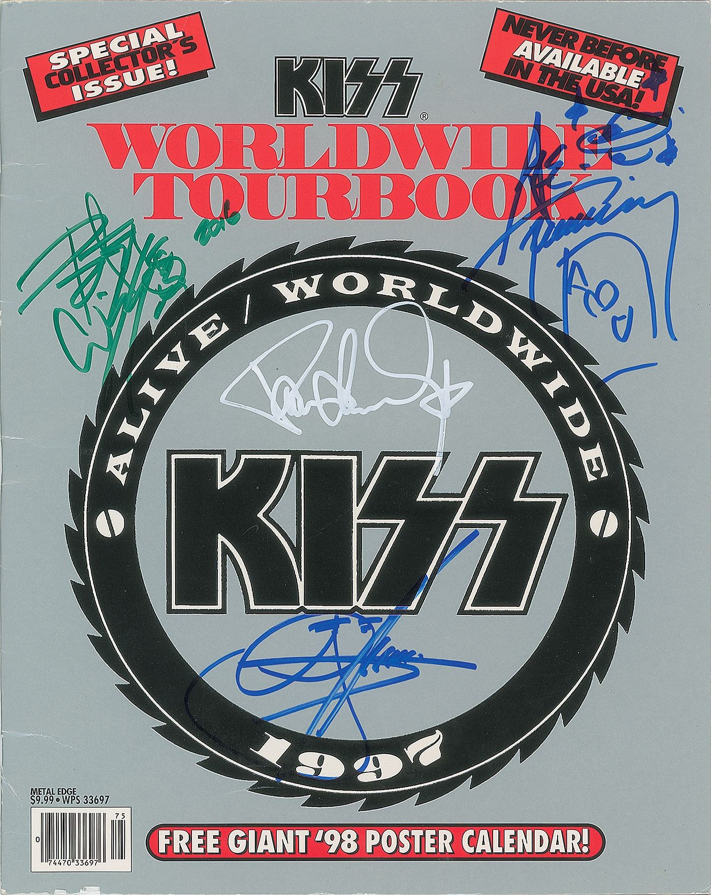 Special collector's program for Kiss's massive 1997 Alive/Worldwide tour, 11 x 14, thirty-six pages, signed on the front cover in silver ink by Paul Stanley, in green felt tip by Peter Criss (adding "2016"), and in blue felt tip by Gene Simmons and Ace Frehley, the latter adding a planet and playing card. The original oversized poster calendar remains intact inside the tour book. In fine condition. Accompanied by a full letter of authenticity from JSA.