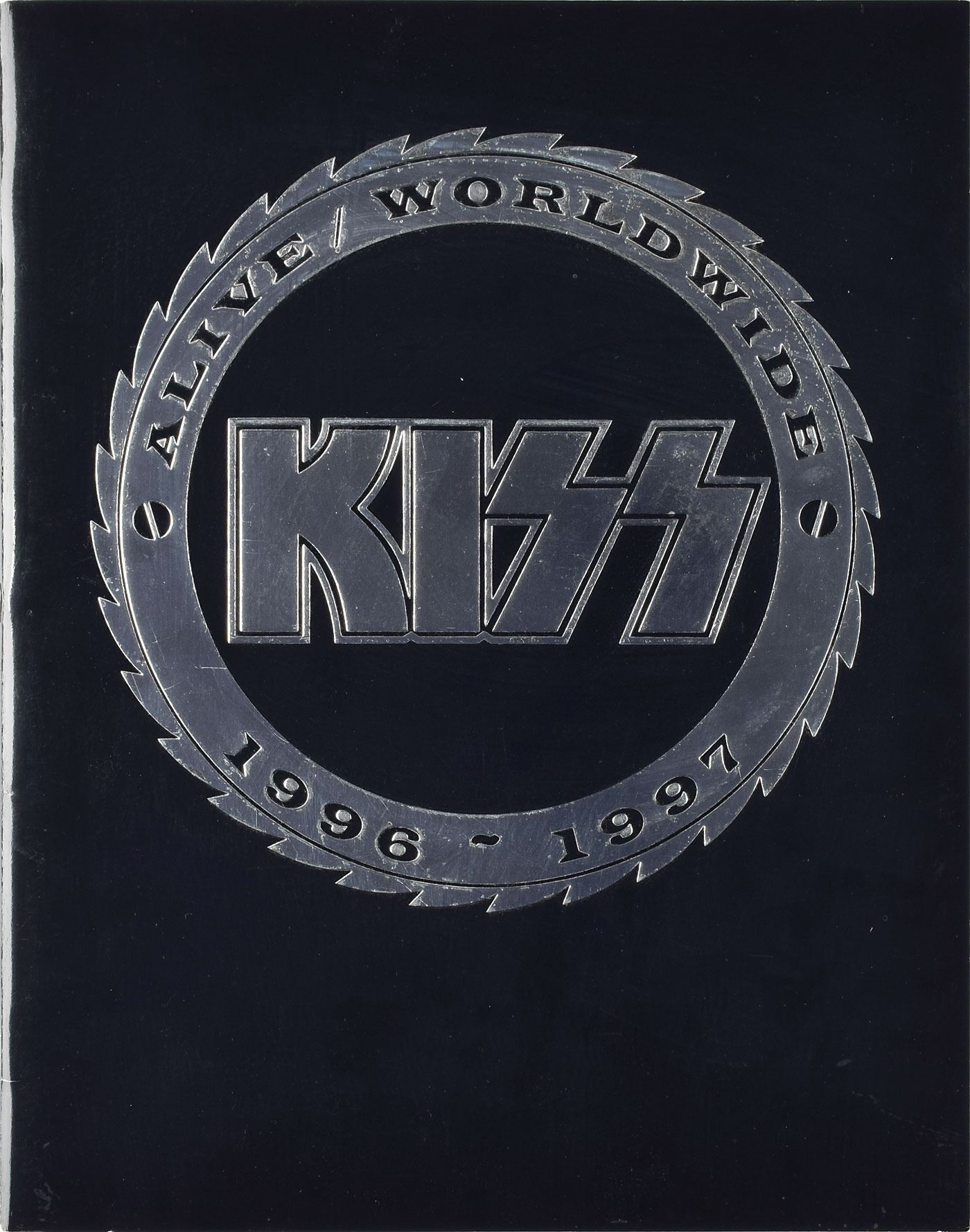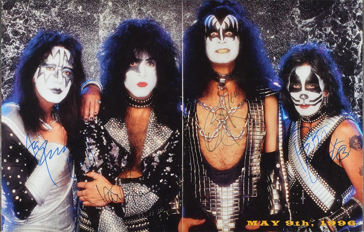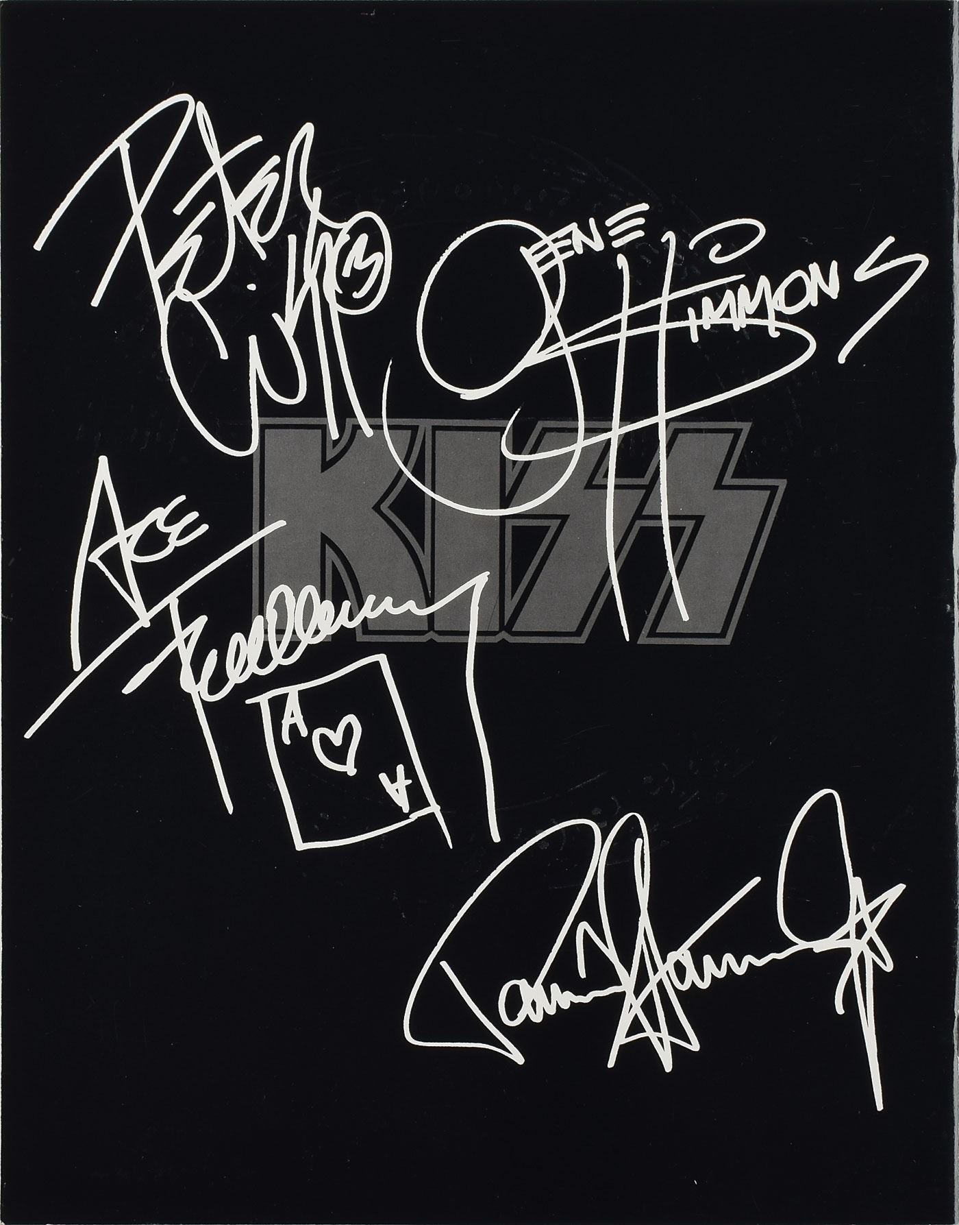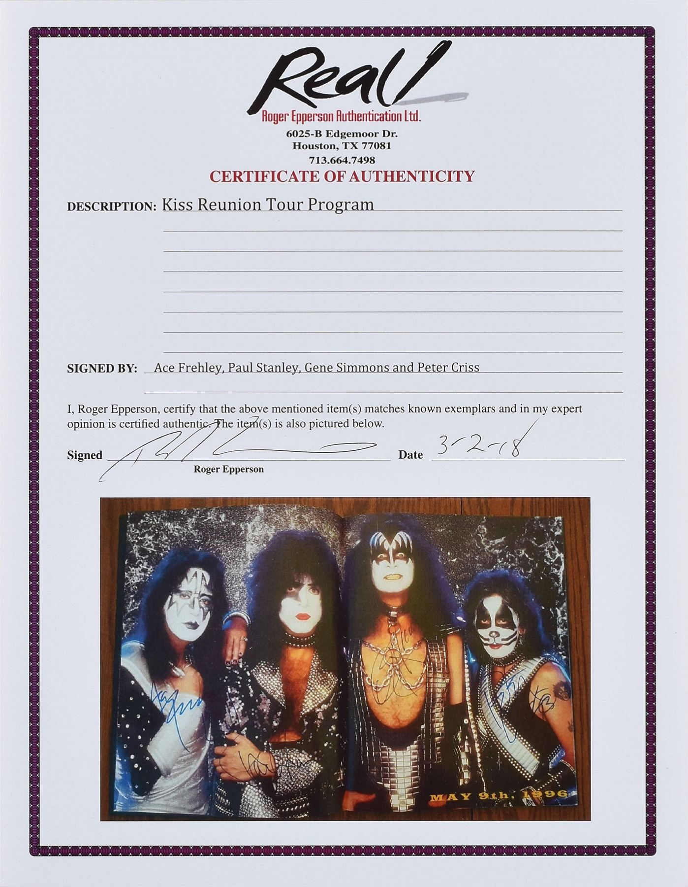 Official program for KISS' 1996–1997 Alive/Worldwide Tour (also known as the Reunion Tour), 11 x 14, signed inside on their group photo in blue or black felt tip by Gene Simmons, Peter Criss, Paul Stanley, and Ace Frehley, who adds a playing card. In fine condition. Accompanied by a full letter of authenticity from REAL.