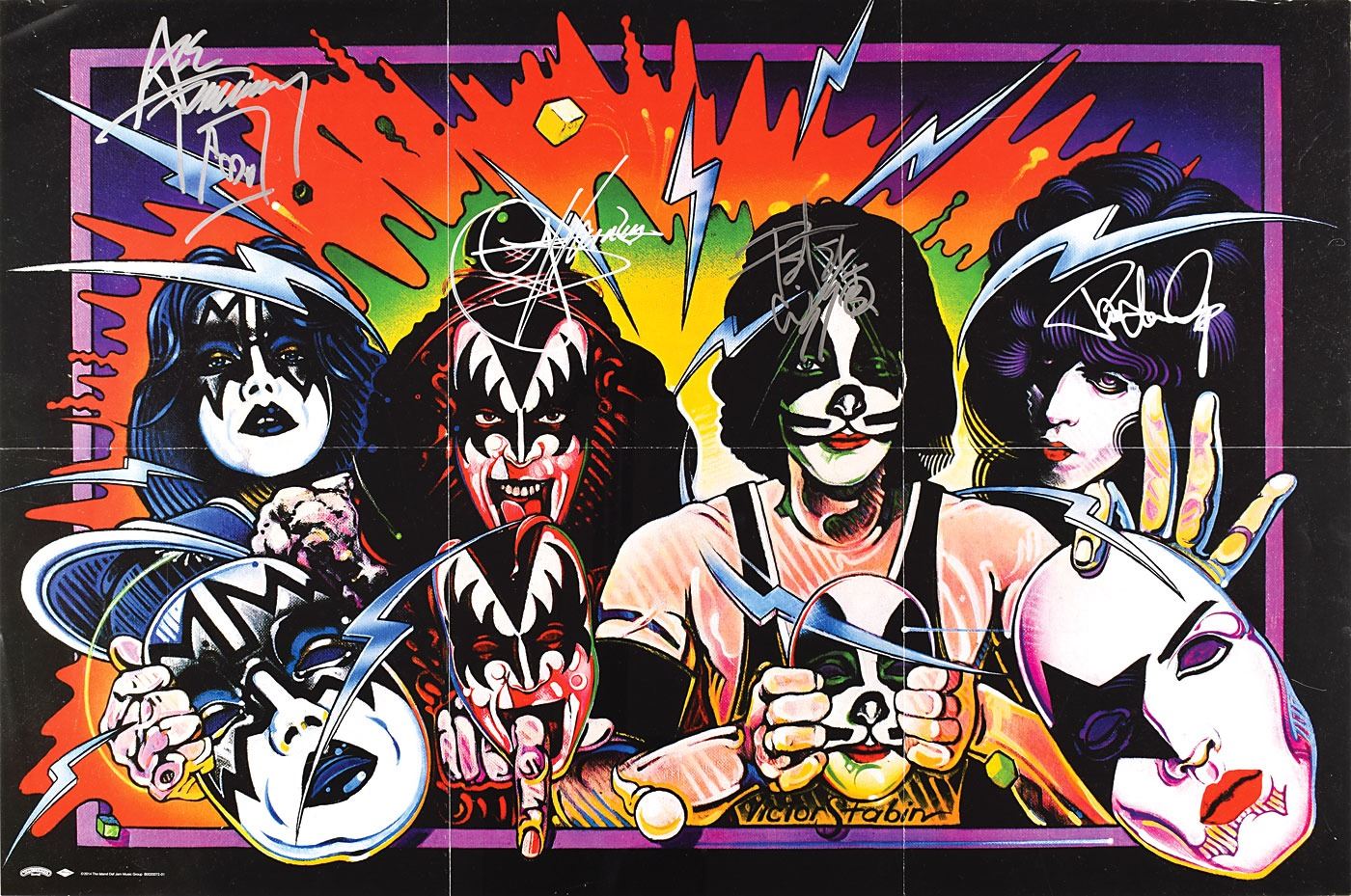 Color 33 x 22 poster entitled 'KISS Unmasked,' featuring stylized artwork by Victor Stabin, signed in silver ink by Gene Simmons, Peter Criss, and Ace Frehley, and in white paint pen by Paul Stanley. Rolled and in fine condition, with intersecting folds, as issued.