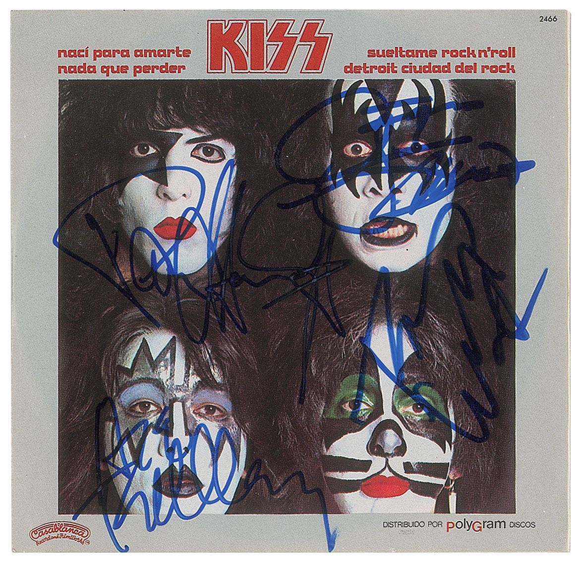 Casablanca Records 45 RPM single Spanish pressing for 'I Was Made for Lovin' You' by KISS, signed on the front cover in blue felt tip by Gene Simmons, Paul Stanley, Peter Criss, and Ace Frehley. In fine condition. The record is included.