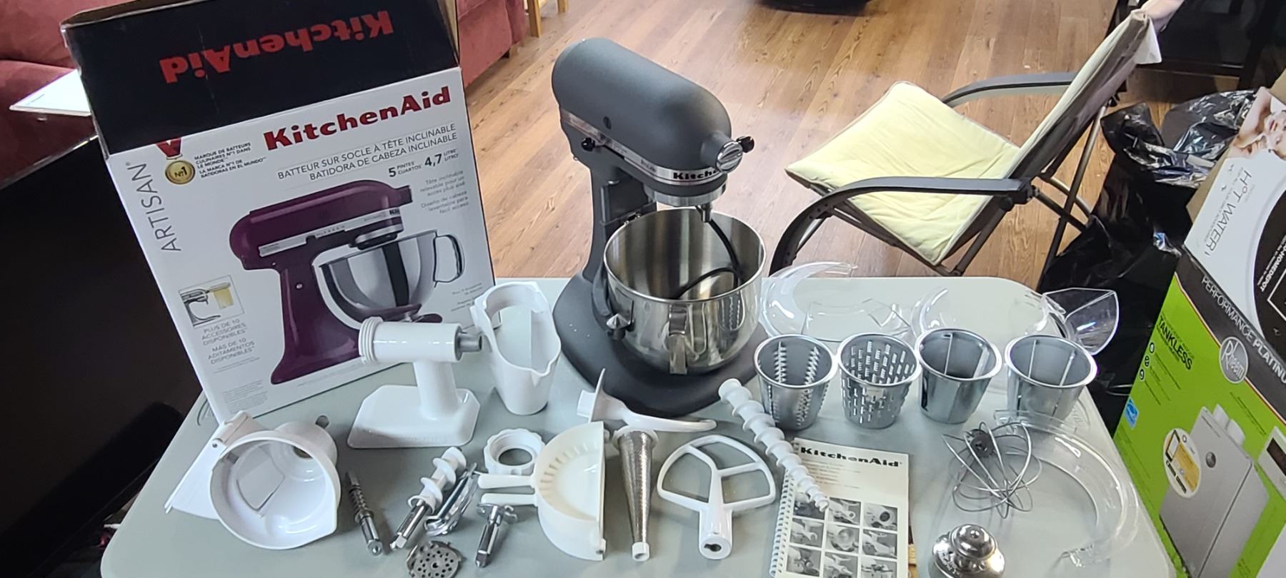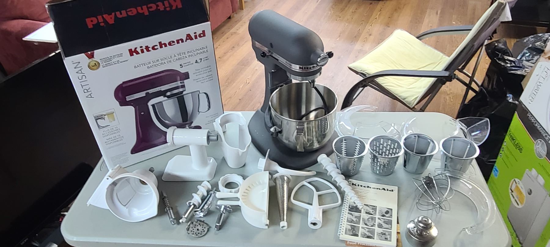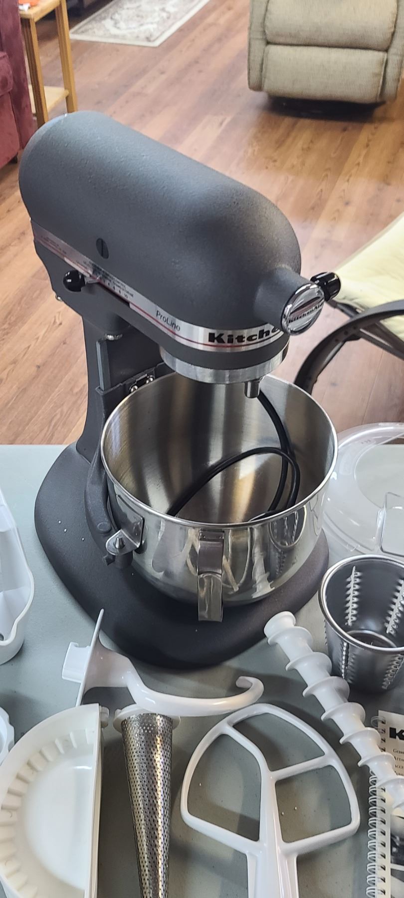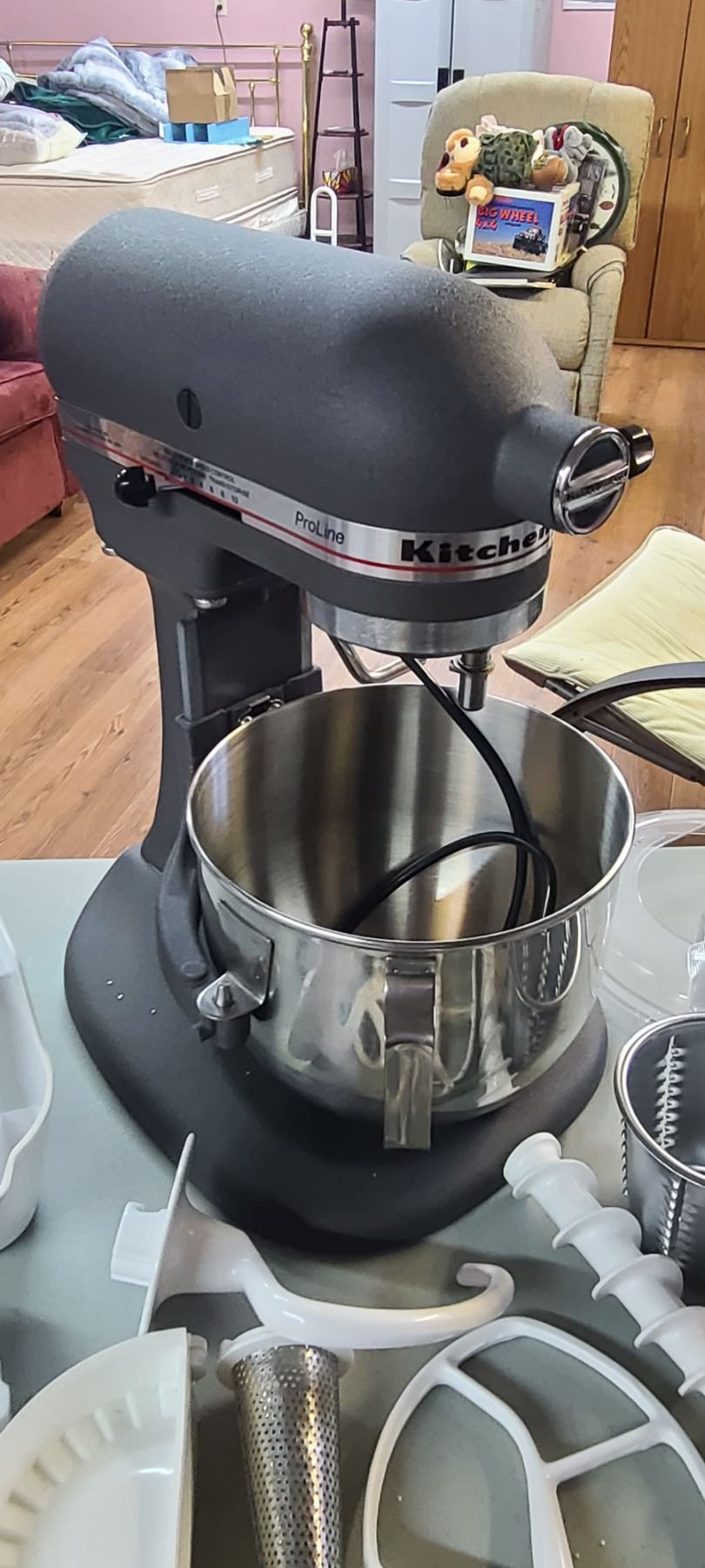 KITCHEN AID PROLINE TILT-HEAD STAND MIXER 5 QUART - 4.7LTR. COMES WITH ADDITIONAL ATTACHMENTS SUCH AS: POURING SHIELD, SAUSAGE STUFFER, ROTOR SLICER, PASTA MAKER, FRUIT AND VEG STRAINER AND MORE