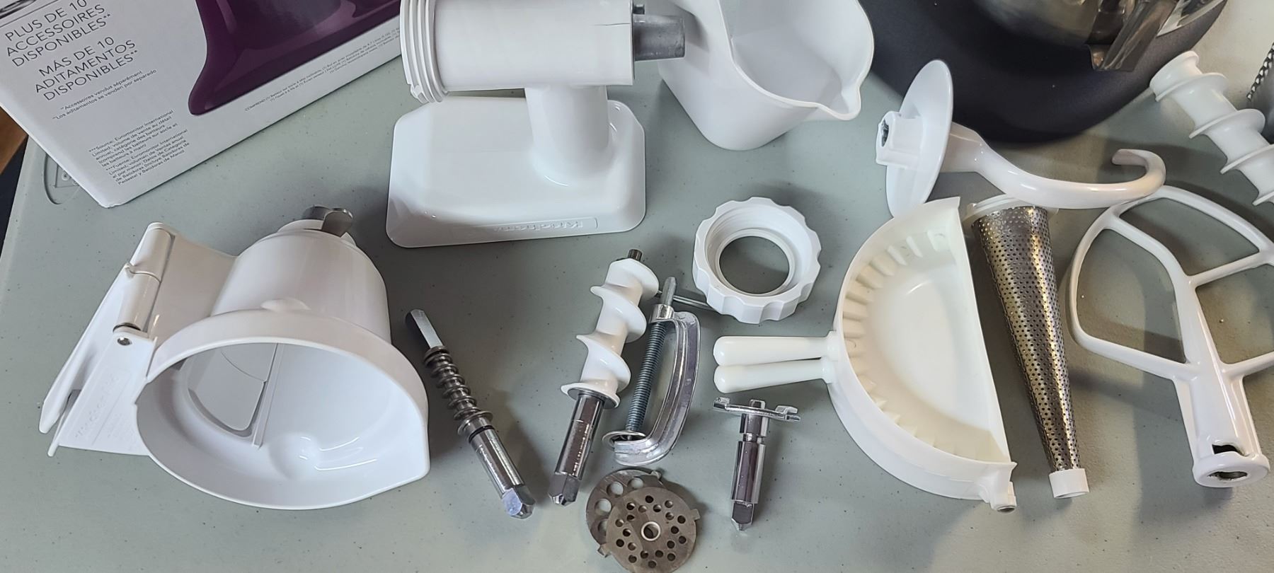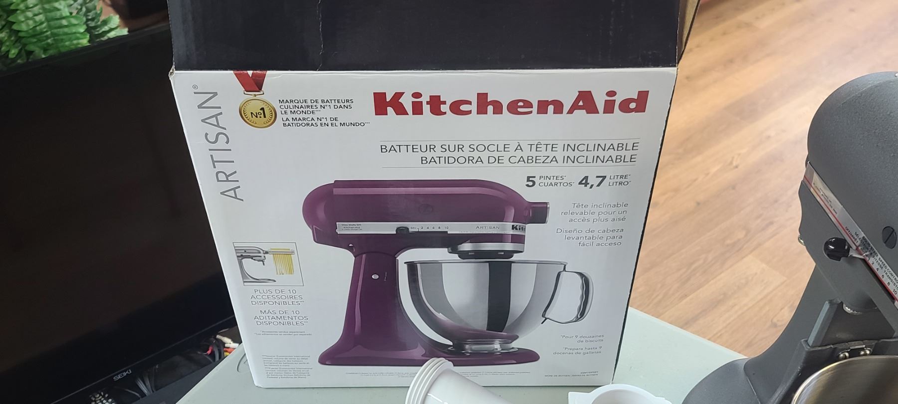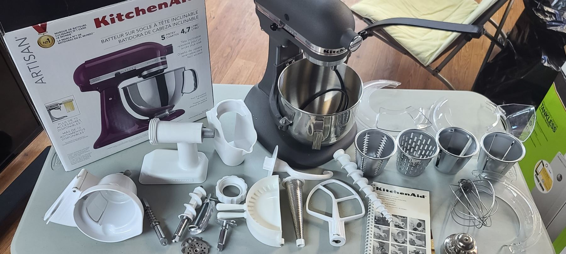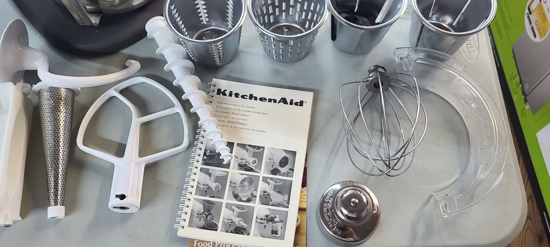 KITCHEN AID PROLINE TILT-HEAD STAND MIXER 5 QUART - 4.7LTR. COMES WITH ADDITIONAL ATTACHMENTS SUCH AS: POURING SHIELD, SAUSAGE STUFFER, ROTOR SLICER, PASTA MAKER, FRUIT AND VEG STRAINER AND MORE