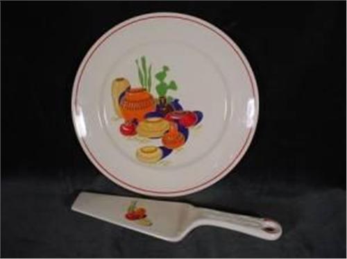 KITCHEN KRAFT HAND PAINTED OVEN SERVE PLATE WITH MATCHING SPATULA. 9.25"X2.5".