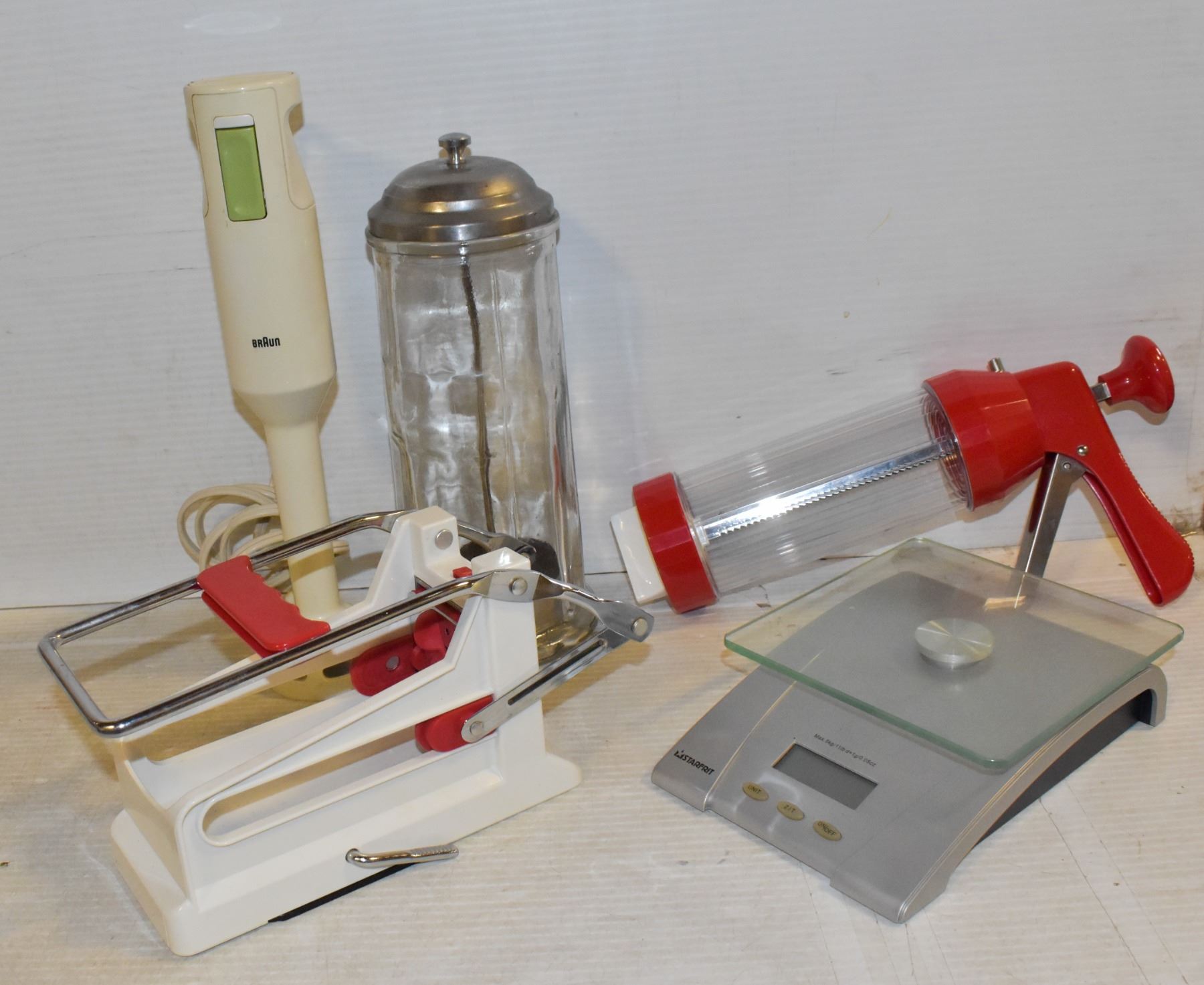 KITCHEN LOT: INCLUDES FOOD SCALE, CUTTER, HAND