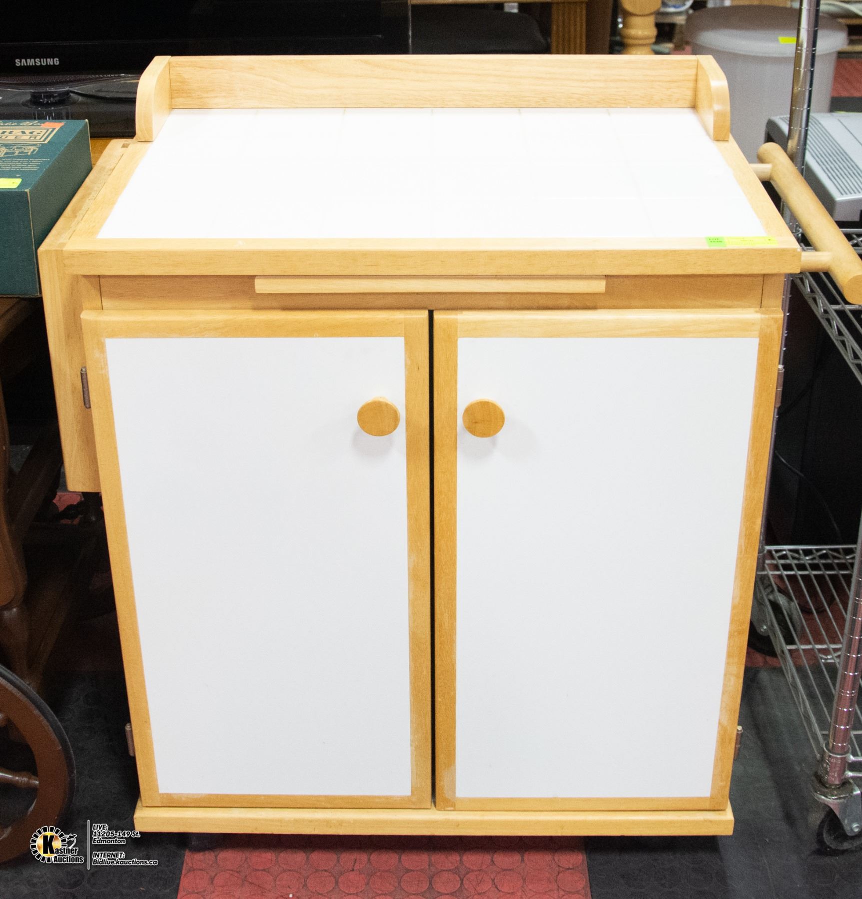 KITCHEN PREP STATION ON WHEELS HAS CUTTING BOARD,