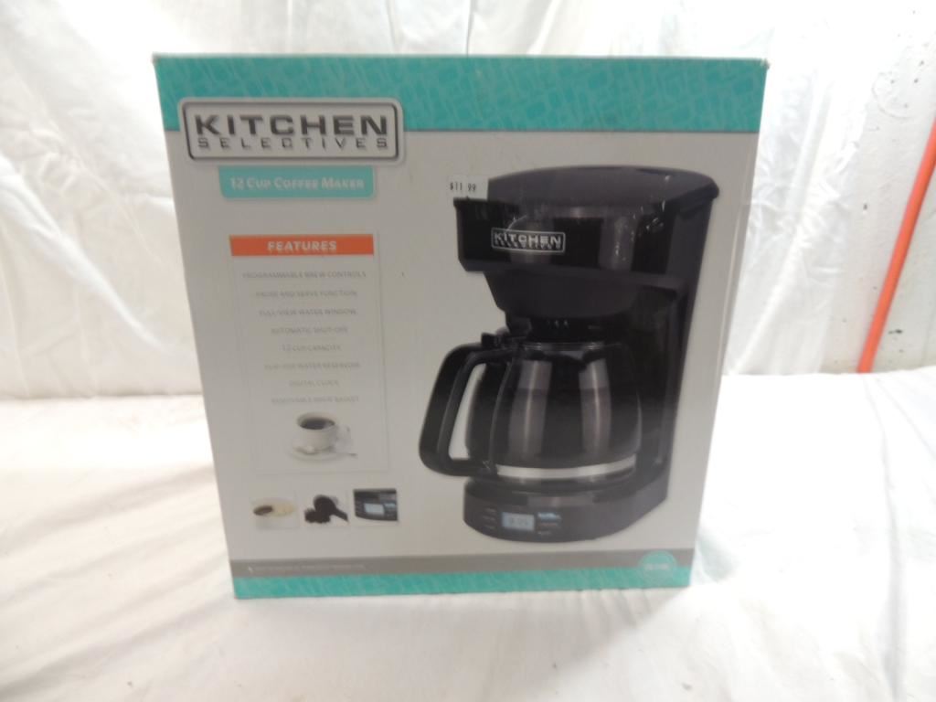 PROGRAMMABLE BREW CONTROLS, PAUSE AND SERVE FUNCTION, FULL VIEW WATER WINDOW, AUTOMATIC SHUT OFF, 12 CUP CAPACITY, FLIP TOP WATER RESERVOIR, DIGITAL CLOCK, REMOVEABLE BREW BASKET IN BOX AS IS AS SHOWN SEE PHOTO FOR MORE DETAILS.