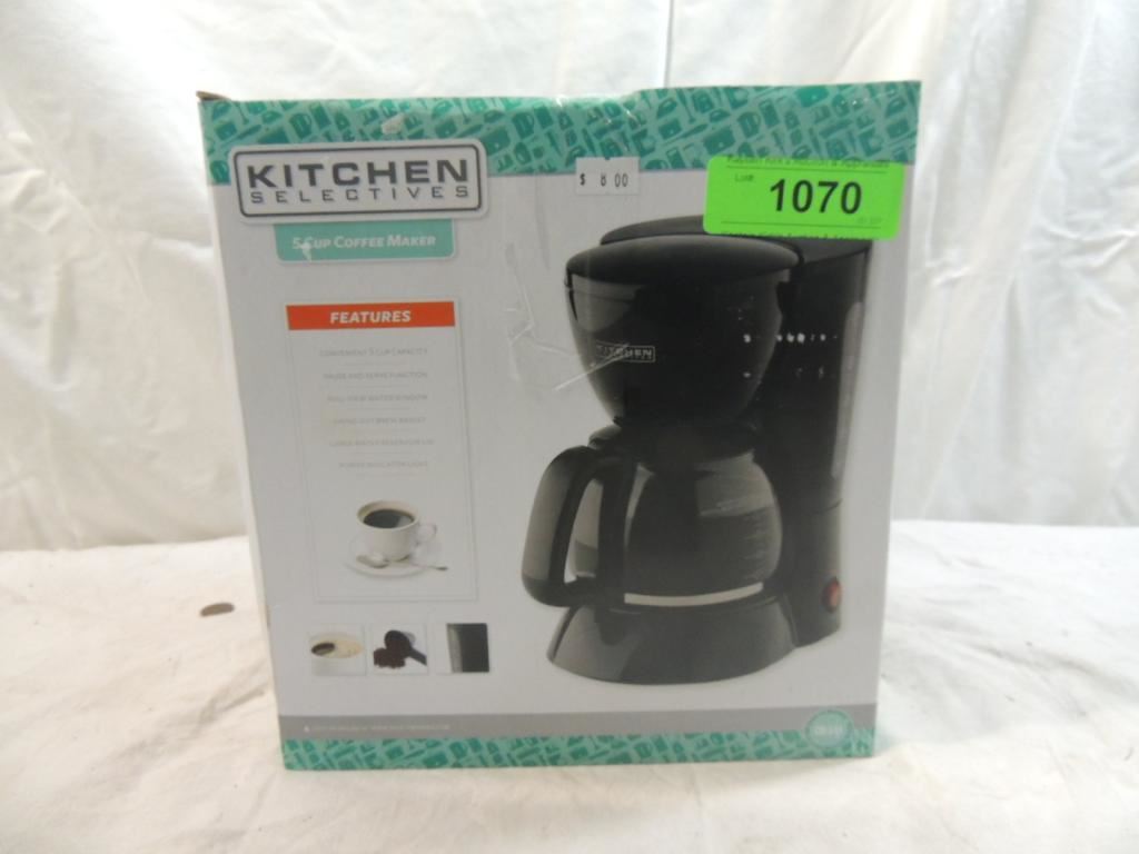 5 CUP COFFEE MAKER, PAUSE AND SERVE FUNCTION, FULL VIEW WATER WINDOW, SWING OUT BREW BASKET, LARGE WATER RESERVOIR LID, POWER INDICATOR LIGHT IN BOX, AS IS AS SHOWN SEE PHOTO FOR MORE DETAILS.