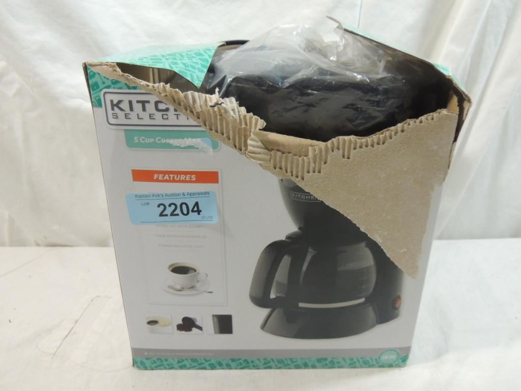 CONVENIENT 5 CUP CAPACITY, PAUSE AND SERVE FUNCITON FULL VIEW WATER WINDOW, SWING OUT BREW BASKET, LARGE WATER RESERVOIR LID, POWER LIGHT INDECATOR, IN BOX AS IS AS SHOWN SEE PHOTO FOR MORE DETAILS