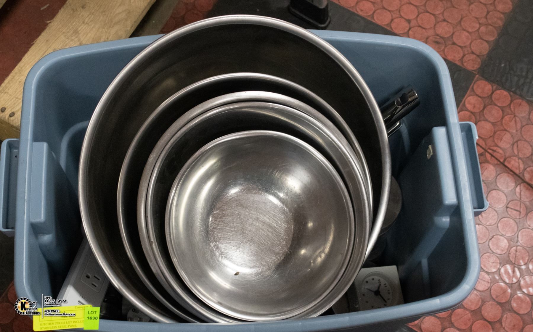 KITCHEN TOOLS LOT INCLUDES STAINLESS STEEL PANS,
