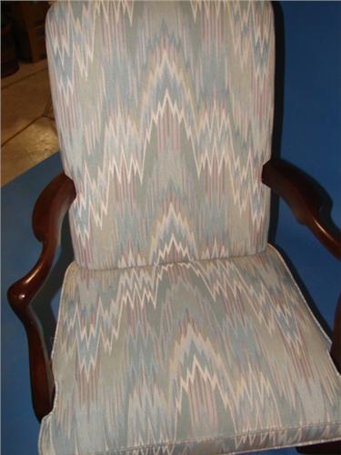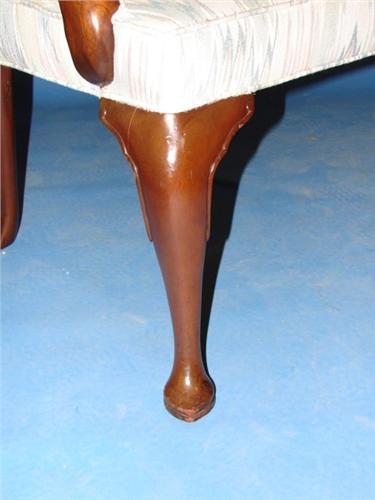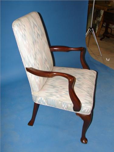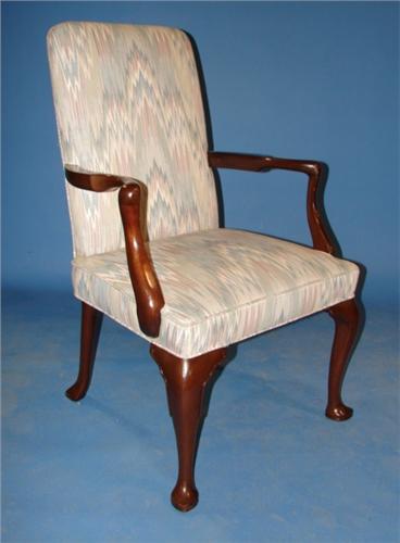 KITTINGER QUEEN ANNE STYLE OPEN ARM CHAIR. Pad feet. Brocade upholstered seat and back. Marked on inside of back leg. 42” H to top of back, 25” W, 22” D
