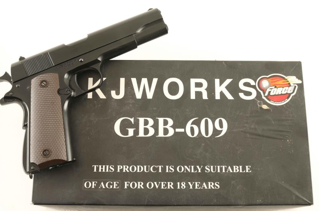 Black finish with faux wood checkered grips. BB Capacity 310-330fps w/ .20g BBs. Range is 100-150ft, able to hold 26Rds. Good condition in box, no CO2 cartridges included. Comes with manual and KJ Works catalog.