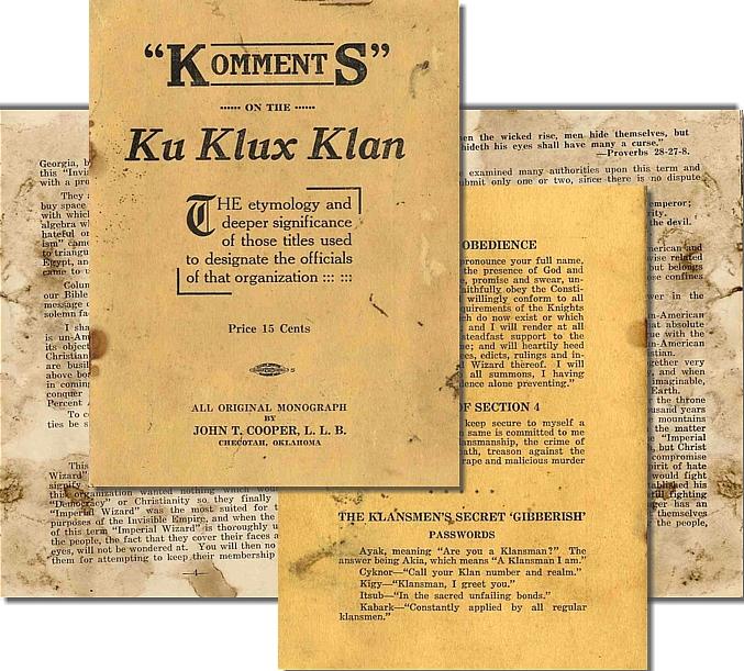 ''Komments on the Ku Klux Klan'' 16pp. booklet, circa 1924. Subtitle: ''The etymology and deeper significance of those titles used to designate the officials of that organization.'' Booklet deconstructs rank titles of Klan hierarchy from Imperial Wizard down to Goblins. Foxing and staining, though not affecting readability. Interesting bonus feature: a typed list of ''The Henryetta Clan No. 24'' membership containing 82 names of men and their places of business. List includes lawyers, Baptist ministers, horse doctors and a court bailiff.