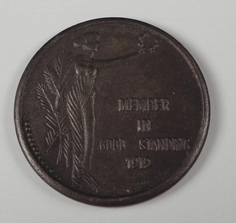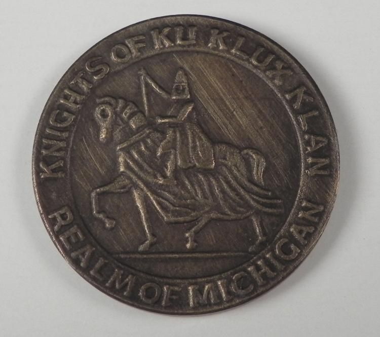 KKK/KU KLUX KLAN 1919 REALM OF MICHIGAN MEMBERSHIP MEDALLION-BRASS 1 1/4" * * FRONT HAS ROBED KKK KNIGHT ON A UNIFORMED HORSE AND READS "KNIGHTS OF KU KLUX KLAN-REALM OF MICHIGAN" REVERSE HAS LADT LIBERTY WITH WREATH & READS "MEMBER IN GOOD STANDING-1919" *