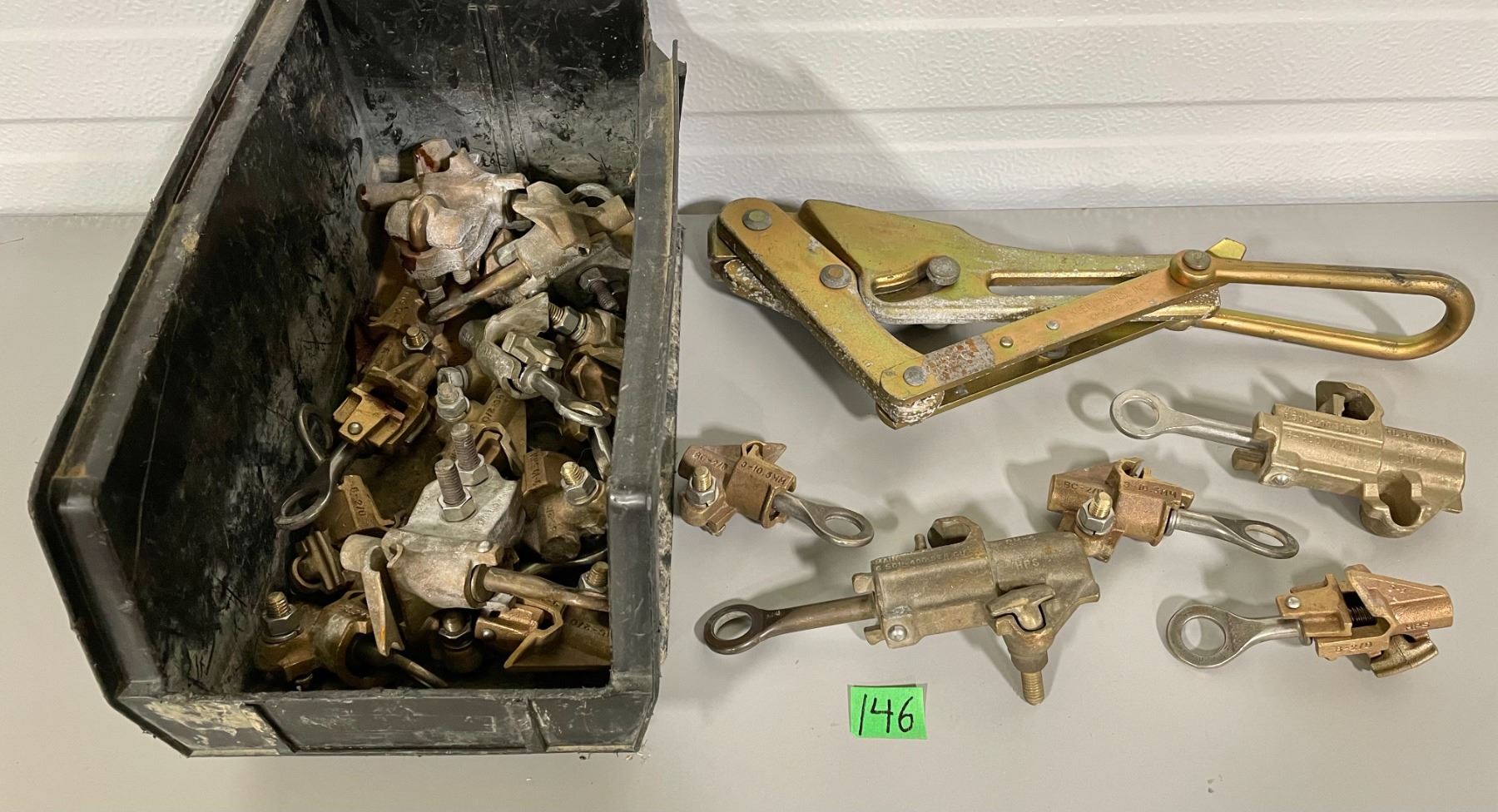 KLEIN TOOLS WIRE STRETCHER AND QTY CABLE BRASS CLAMPS