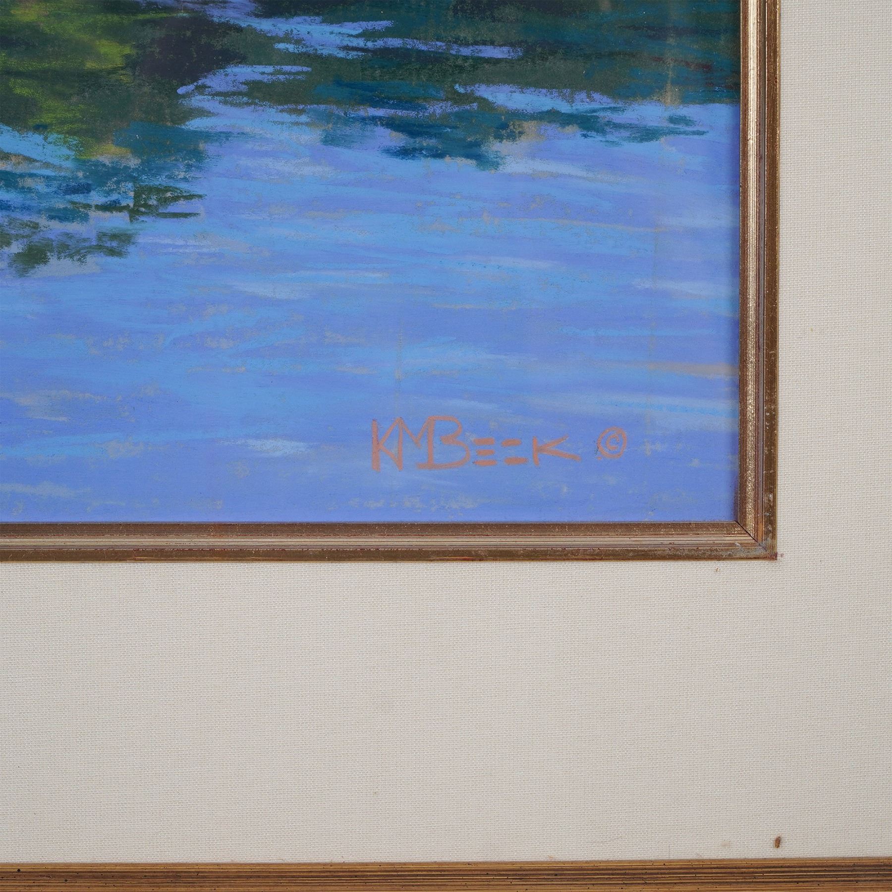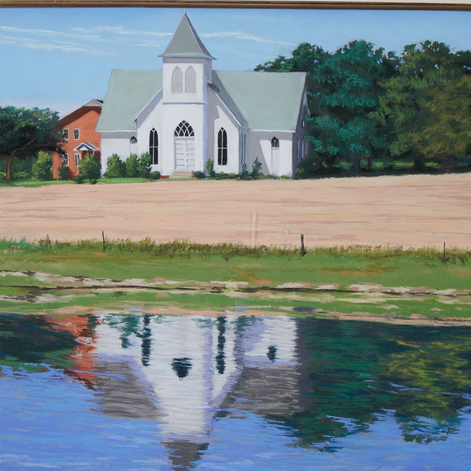 A serene pastel landscape by artist KM Beek, depicting a white church with its reflection mirrored in the calm waters below. This framed artwork beautifully captures the tranquility of the scene with vibrant colors and delicate shading. The detailed rendering of the architecture and natural surroundings enhances the depth of the composition. Housed in a classic gold-tone frame with a linen mat. Measures 35"L x 29"H.