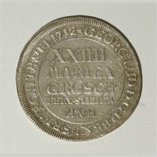 <B>Brunswick-Luneburg-Calenberg-Hannover. George Ludwig 24 Mariengroschen 1712-HH,</B></I> KM73, choice AU, very sharp details.<BR><BR><b>Shipping:</b> Coins & Currency (<a target="_blank" href="http://www.heritageauctions.com/common/shipping.php">view shipping information</a>)