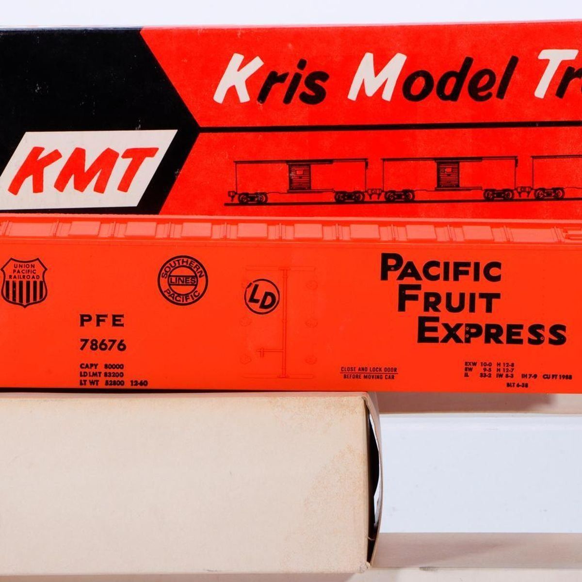 KMT - 7 box cars with boxes: Illinois Central Orange Box Car. Road Number IC200156. Opening doors. Chassis does not have trucks and is not fastened to car body. In original plain white box. Penn Central Green Box Car. Road Number 274002. Opening doors. Chassis does not have trucks and is not fastened to car body. In original plain white box. Pacific Fruit Express Orange and Black Reefer. Road Number 78676. Chassis does not have trucks and is not fastened to car body. In original plain white box. Norfolk and Western Brown Box Car. Opening doors but one door guide and door are loose. Chassis does not have trucks and is not fastened to car body. Plastic bag has loose door guide, door, one door guide pin, screws to mount chassis to body. In original plain white box. REA Express Green Refrigerator Car. Opening doors. Chassis has trucks and is fastened to car body. One truck has corrosion on bolster. In original white box. Southern Pacific Brown Box Car. Opening doors. Chassis has trucks and is fastened to car body. In KMT Red-Orange/Black Box. Soo Line Brown (box label says red) Box Car. Opening doors. Chassis has trucks and is fastened to car body. In KMT Red-Orange/Black Box.