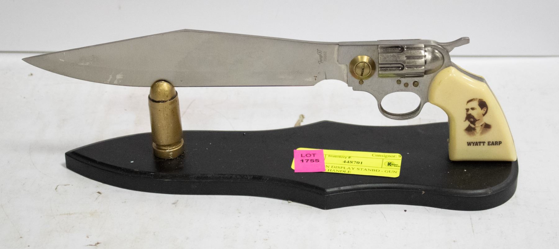 KNIFE ON DISPLAY STAND - GUN THEMED HANDLE