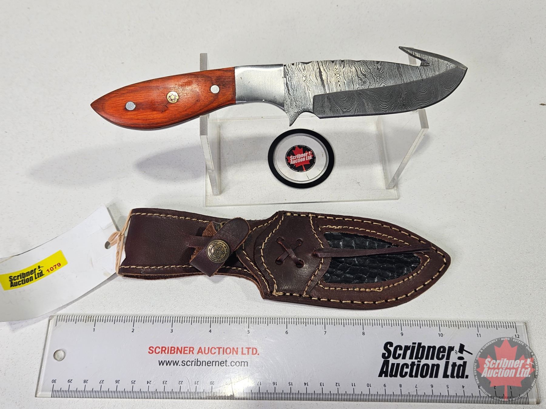 KNIFE : w/Leather Sheath (Consignor Tag ~ Damascus Skinner Gut Knife : Laminated Handle w/Mosaic Pin)