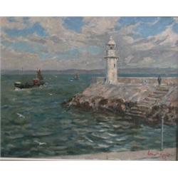 KNIGHT, Ernest. "The Brixham Light". Huile sur toile, signée. Signée et titrée verso. École anglaise. Oil on canvas, signed. Signed and titled verso. English School. 16" x 20" - 40.5cm x 50.8cm. $700/900
