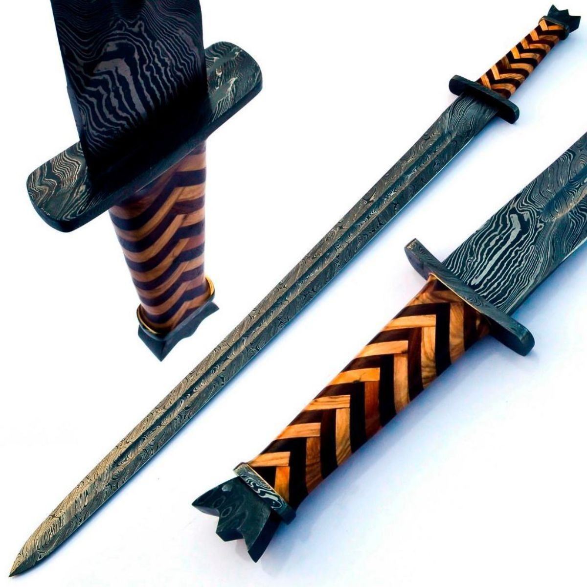 For Auction Is A Stunning Handmade KNIGHTHOOD Damascus Steel Medieval Inspired Sword With A Stunning Inlay Rose Wood Handle. Each blade is created Using 256 Layers Of 1095 and 15N20 High Carbon Steels​​​​​​ To Produce A Superior Edge And Maintain A High Tensile Strength In the Steel. The Handle Is Made Of Select Rose Wood Layered And Turned To Produce A Stunning Finish. The Pommel Features a 3 Pronged End Grip To Give An Aggresive Profile To The Blade. Damascus Steel Blade with 256 Layers on it. HARDNESS 56-60 H R C Handle: Rose Wood with Styled Inlay