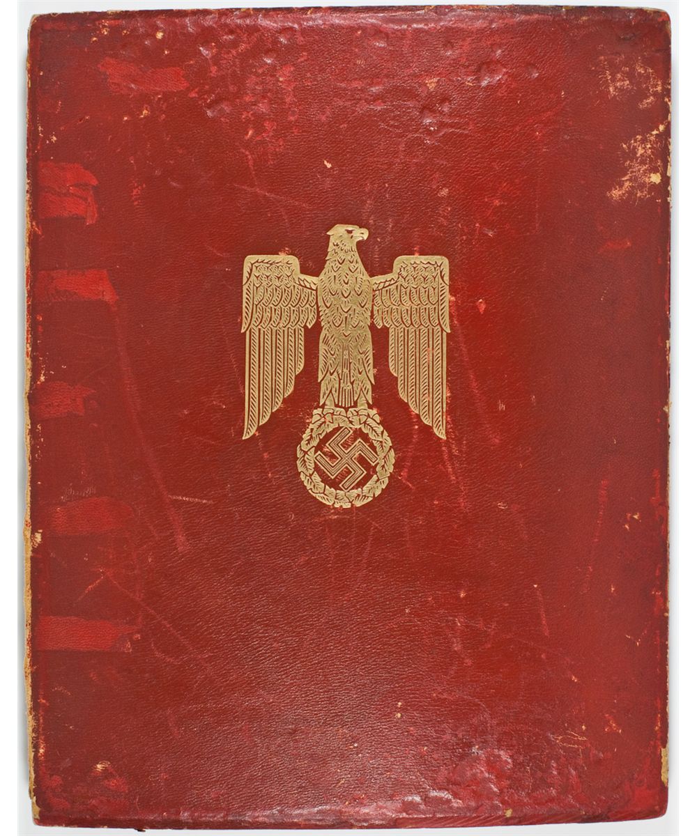 Rare, original formal presentation folder for the formal Knights Cross award document, 14 1/8" x 17 5/8", the boards covered in burgundy grained red leather and the front cover bearing a left-facing eagle clutching a wreath encircling a swastika. Within, the folders are lined in parchment with the outer edges bearing the same red leather bearing double lines of gilt trim. The maker's name, "FRIEDA THIERSCH", appears in small embossed gilt letters at the bottom of the inside of the rear cover. This example bears significant damage, having been separated at the central hinge, and is worn, abraded and bumped almost throughout - nevertheless, it is the "real deal" and once restored could be matched with any Knights Cross award. Should be examined.