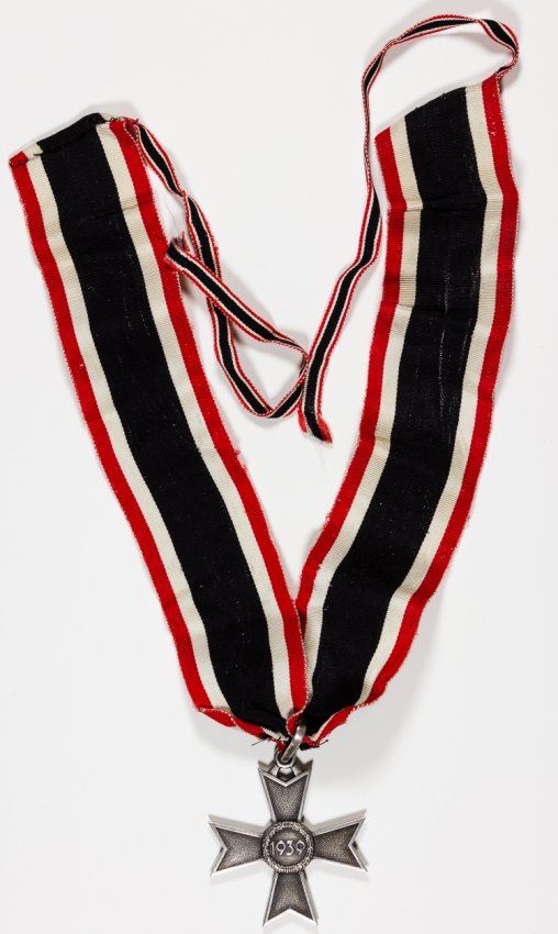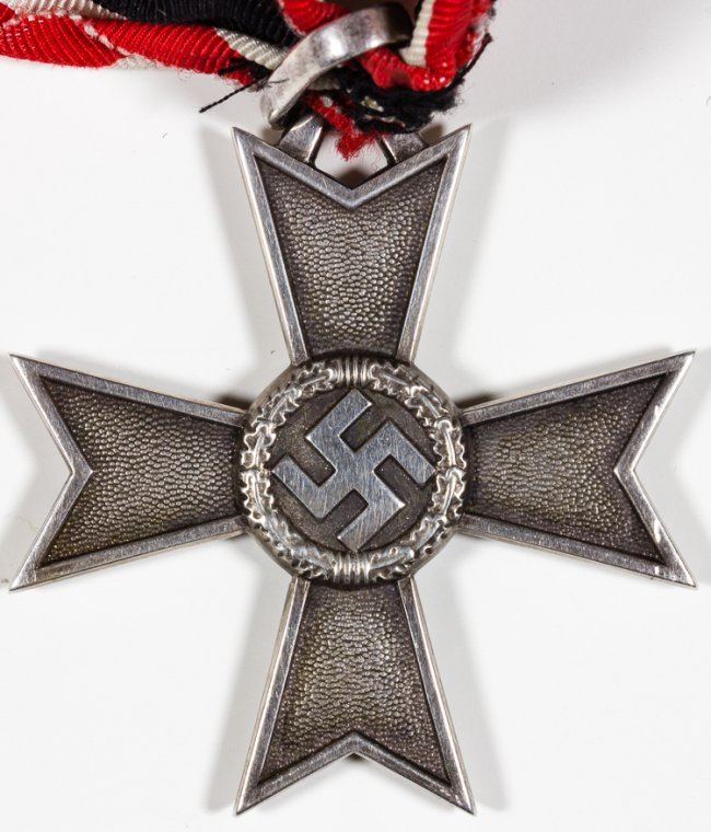 Knight's Cross of the War Merit Cross Without Swords by Deschler & Sohn, with original worn neck ribbon and tie. This pristine award bears Deschler's "1" stamp as well as a "900" purity stamp on the bottom of the lower arm. A superior exampls, in mint condition. The Knights Cross of the War Merit Cross Without Swords was instituted on August 19, 1940 and was awarded for outsanding military or civilian merit not involving front line combat service.