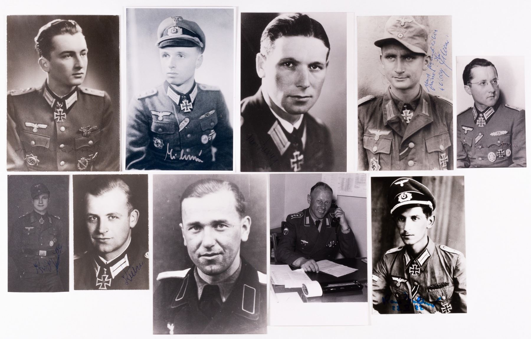 Lot of ten b/w photographs signed by Knight's Cross winners. Photos of Hans Dratwa, Hans Drexler, Wilhelm Kubel, Johannes Ksiag, Wolfgang von Malotki, Wilhelm Kleeman, Rudolf Donth, Rene Dollwet, Volkhard Eitner, and Hans Eikmeier. Average 2.5 x 4 inches each.