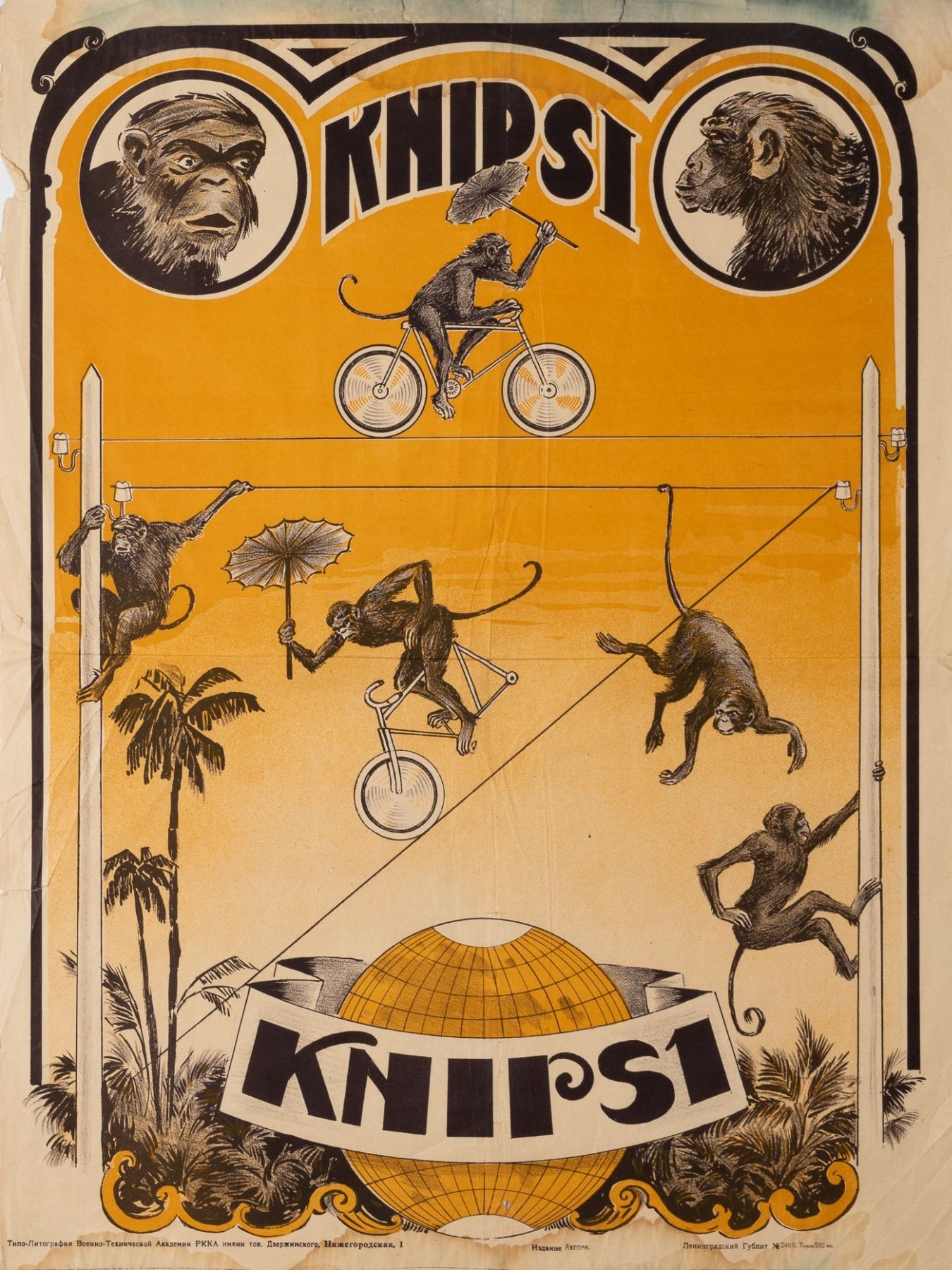 Scarce Russian circus poster featuring monkeys, 'Knipsi', Red Army Printing House, 1920s, limited edition of 500, approx. 22 x 29 inches. Soiling at top and bottom margins, various sized tears and chipping, mailing folds, some creases.