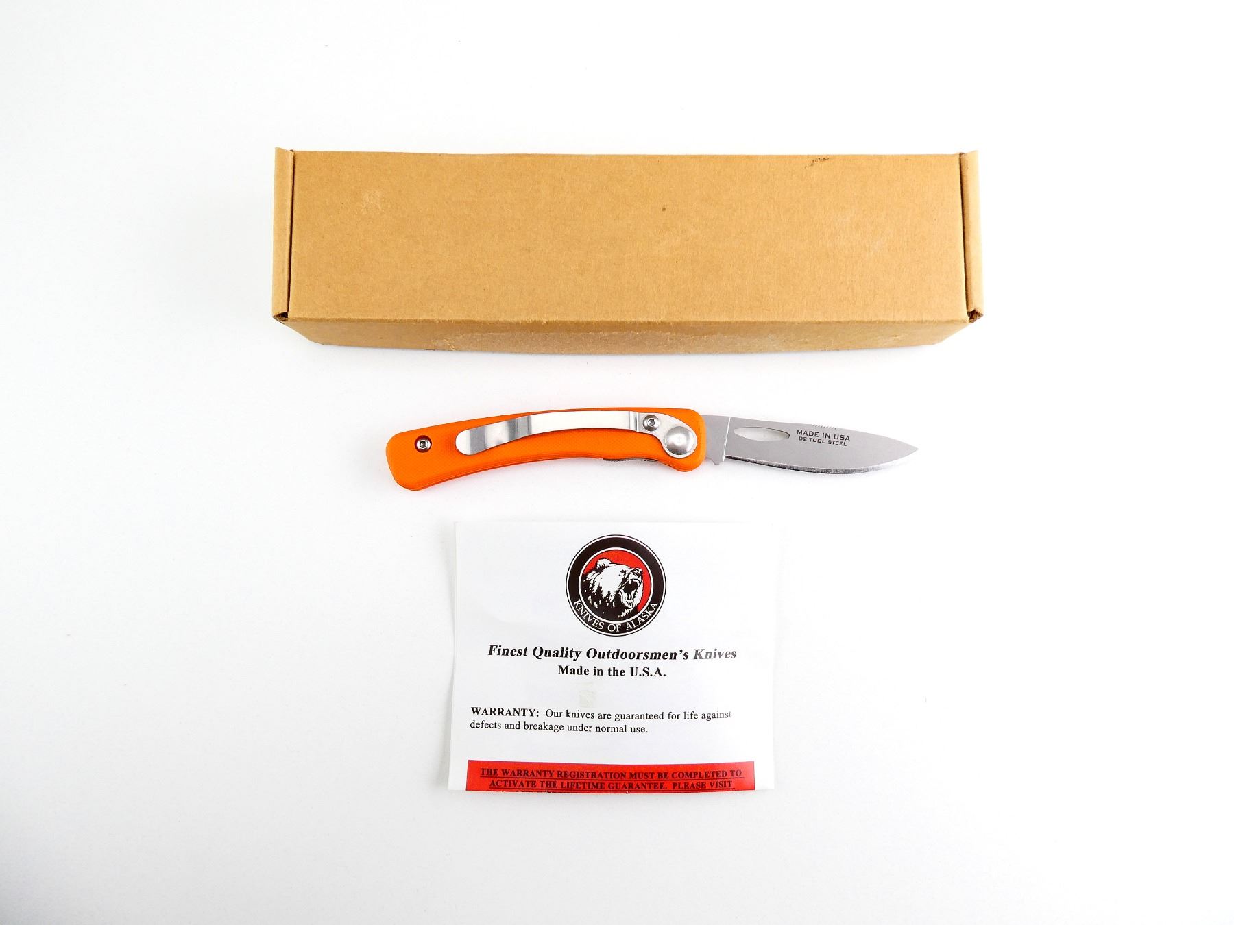 (1) STEEL FOLDING BLADE, HUNTER ORANGE HANDLE, MARKED: "FEATHERLIGHT HUNTER, KNIVES OF ALASKA" & "MADE IN USA, D2 TOOL STEEL", WITH INSTRUCTIONS, APPEARS NOS IN ORIGINAL PACKAGING, BLADE APPROX. 3" & OAL APPROX. 7.25". SEE PHOTOS.