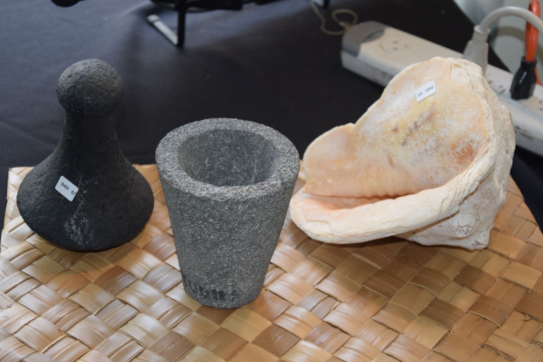 KNOBBED POI POUNDER (POSSIBLE REPRODUCTION) (6 1/2"); MORTAR OF "LEEWARD HAWAIIAN STONE" & ANCIENT HAWAIIAN CONCH SHELL (FOUND ON KAUA'I) (FROM GLAISYER COLLECTION) (3 PCS)