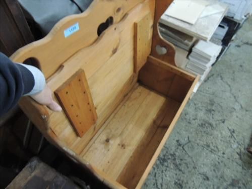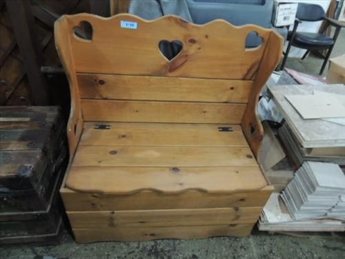 KNOTTY PINE HIGH BACK BENCH & FLIPTOP STORAGE AREA. 36X18X38. AS SHOWN. VIEW PICTURE FOR DETAIL.